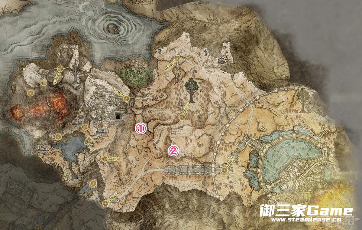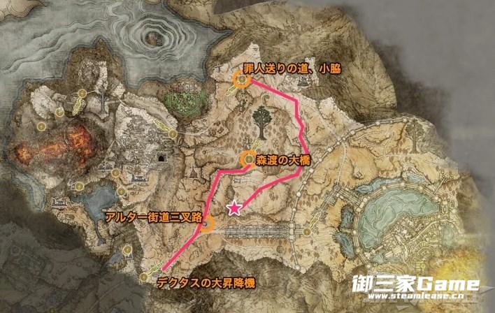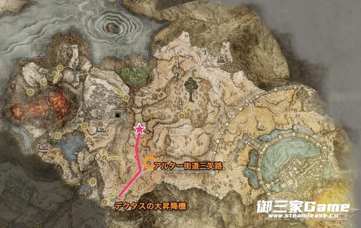 离开迪可达斯大升降机后,沿着大路一直往前走,到达桥的尽头会发现一个“传送点”,从此位置飞到另一侧的山上,然后往右绕路到唤雷教堂(参考下方粉色路线及星标位置)。