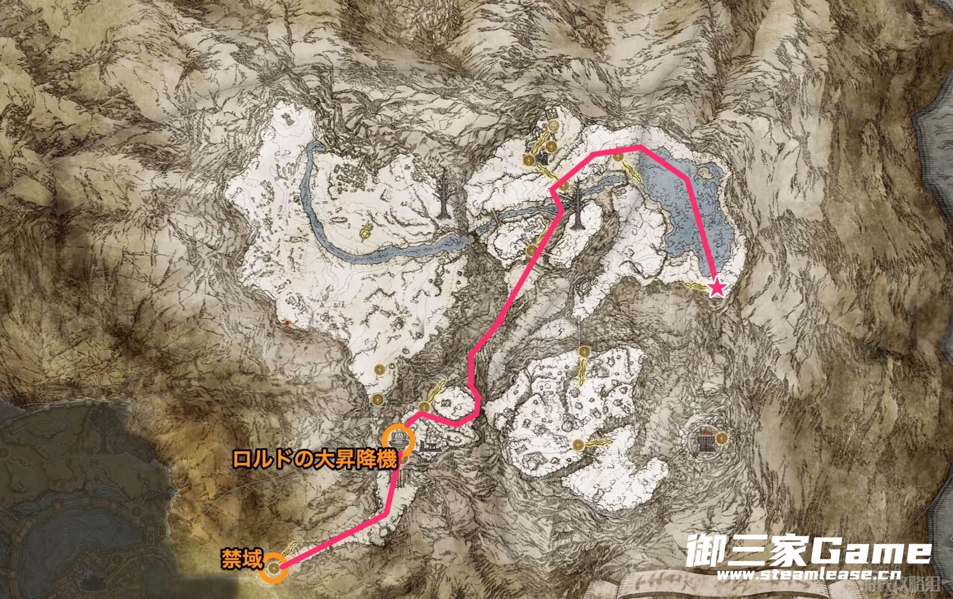 (下图中橙色标记赐福点位置自下至上依次为禁域、洛德大升降机;粉色路线为前往玛莉卡第一教堂的路线,星标位置为玛莉卡第一教堂)
