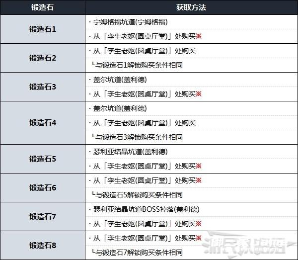 锻造石1~2可以通过将「锻造石矿工的铃珠1」交给圆桌厅堂的「孪生老妪」来解锁购买,「锻造石矿工的铃珠1」可通过击败位于利耶尼亚的「雷亚卢卡利亚结晶坑道」的BOSS来获得,推荐挑战等级为30级。