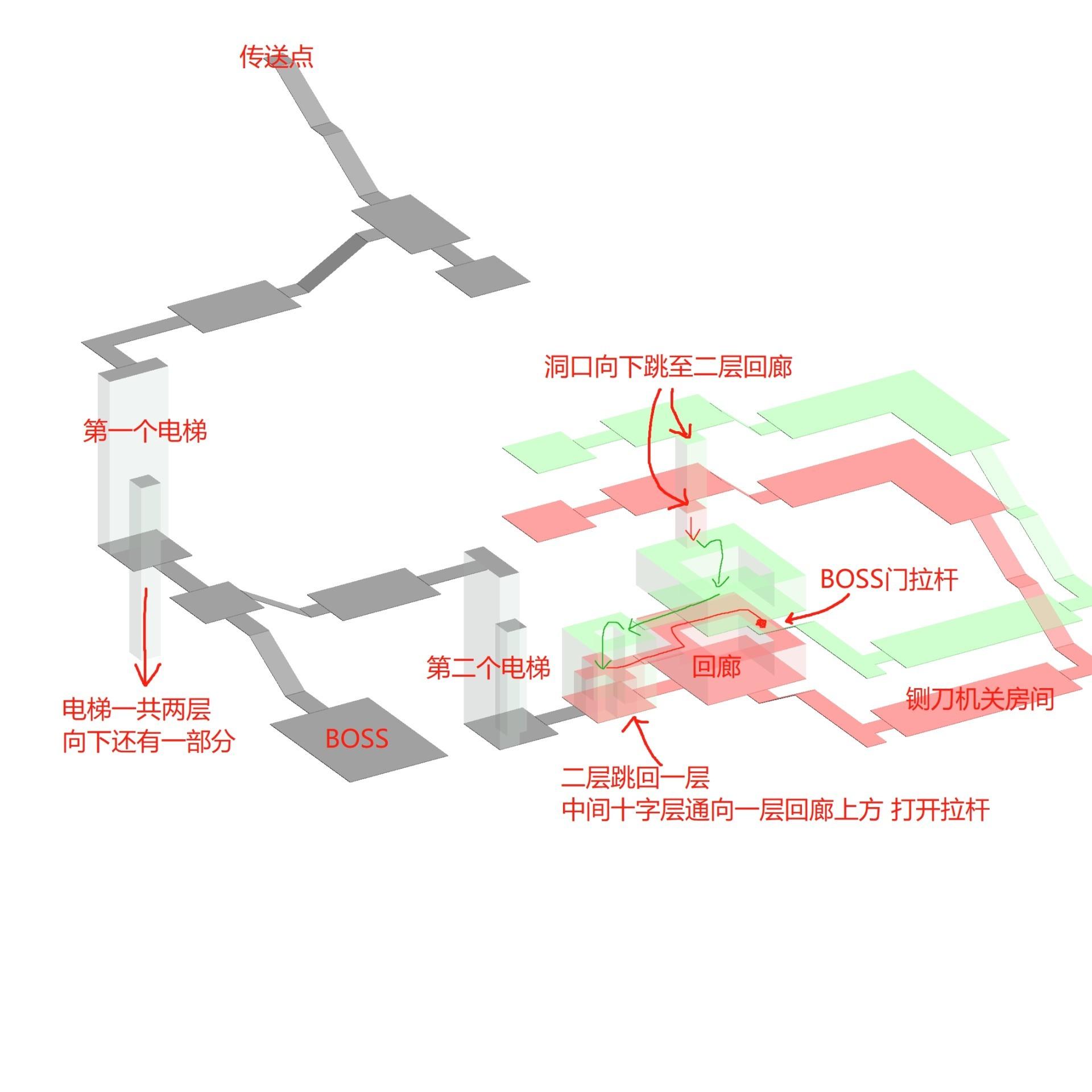 需要注意的是第一个长电梯是双层电梯,往下去还有一部分,下面就一条路不是迷宫我就没画出来。