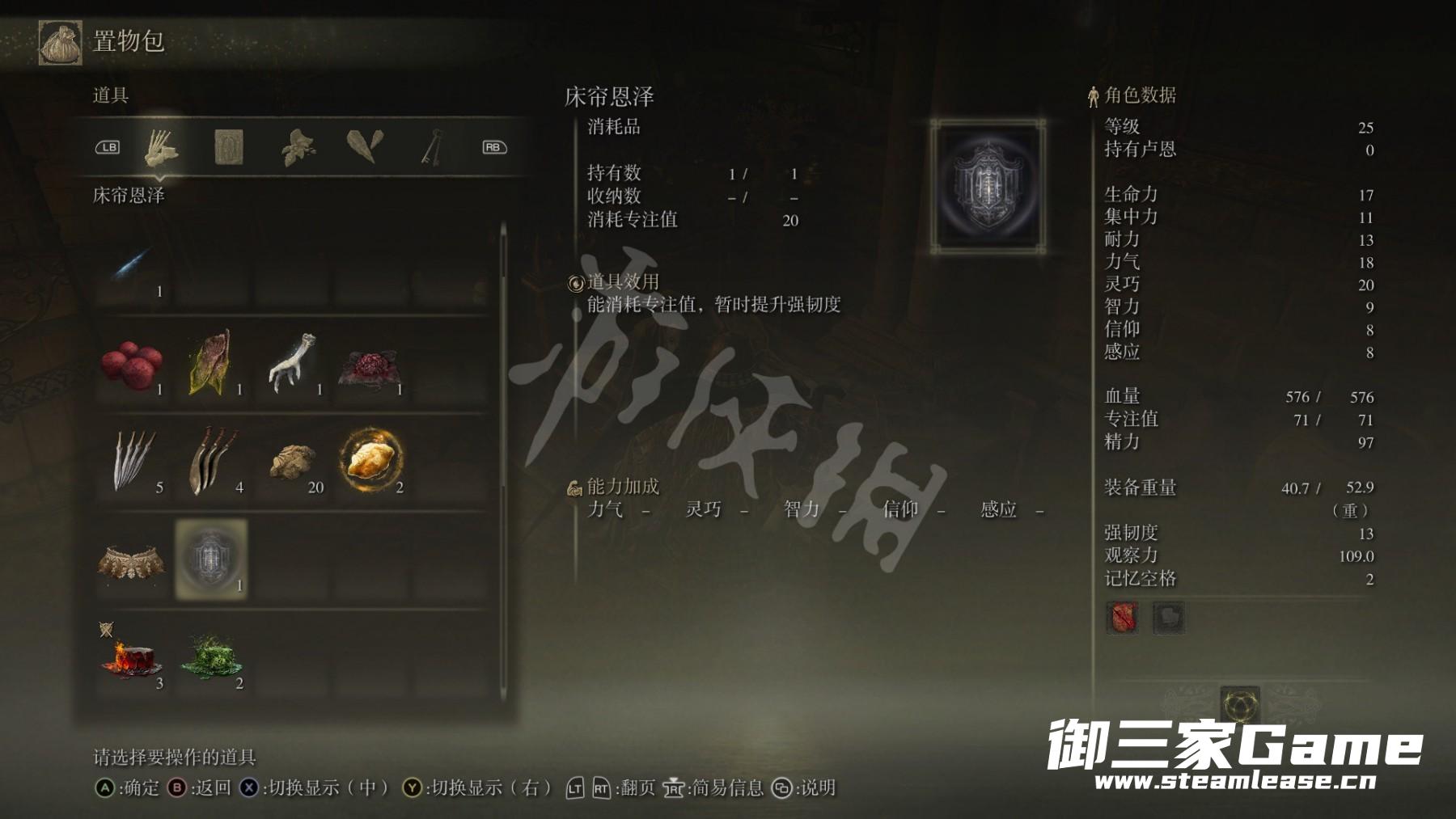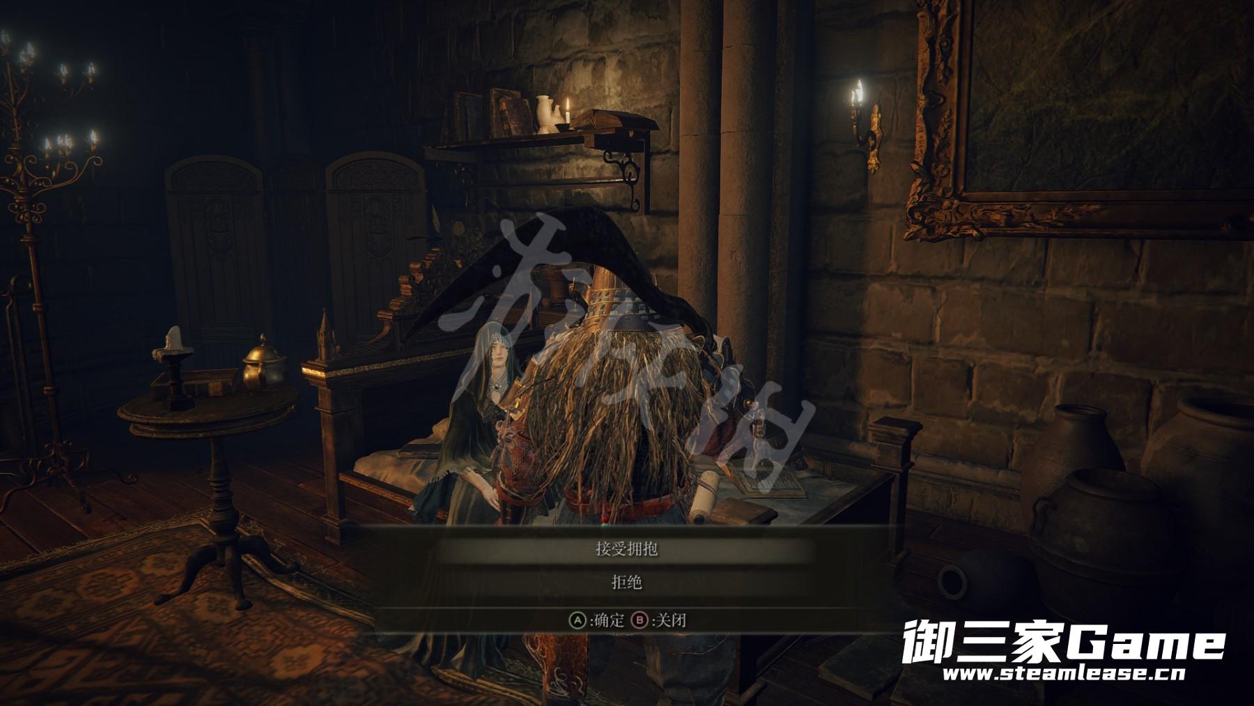 在铁匠走廊旁边的房间里有一位名叫菲雅的黑裙少女,与她对话后选择[接受拥抱]会获得道具【床帘恩泽】(消耗专注值暂时提升强韧度)。