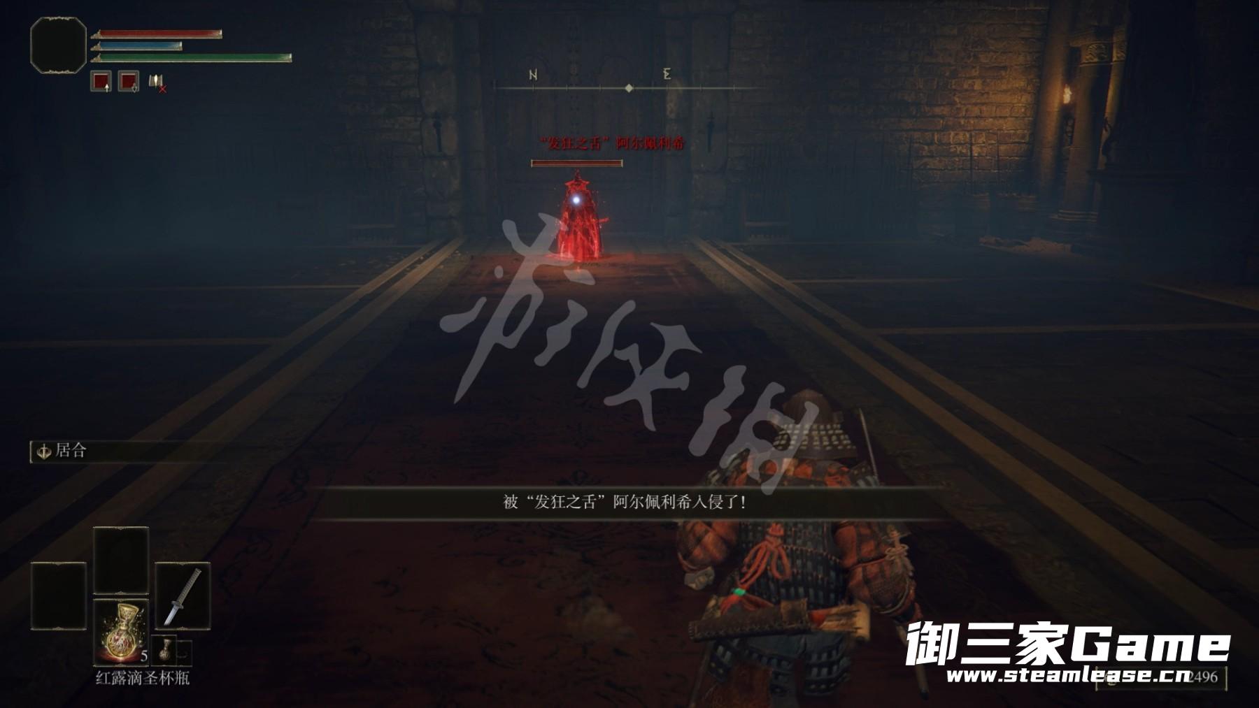 在一楼大厅会遇到一个入侵的Npc“发狂之舌”,用重武器持续打出硬直可以轻松消灭,注意他的攻击会附带冻伤和出血的Debuff,半血时会嗑药回复一次。