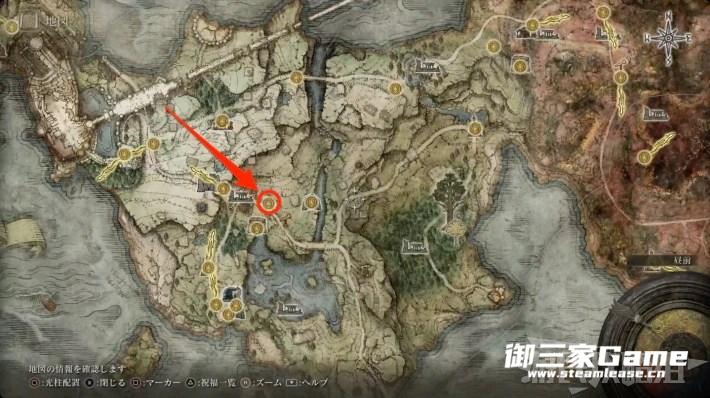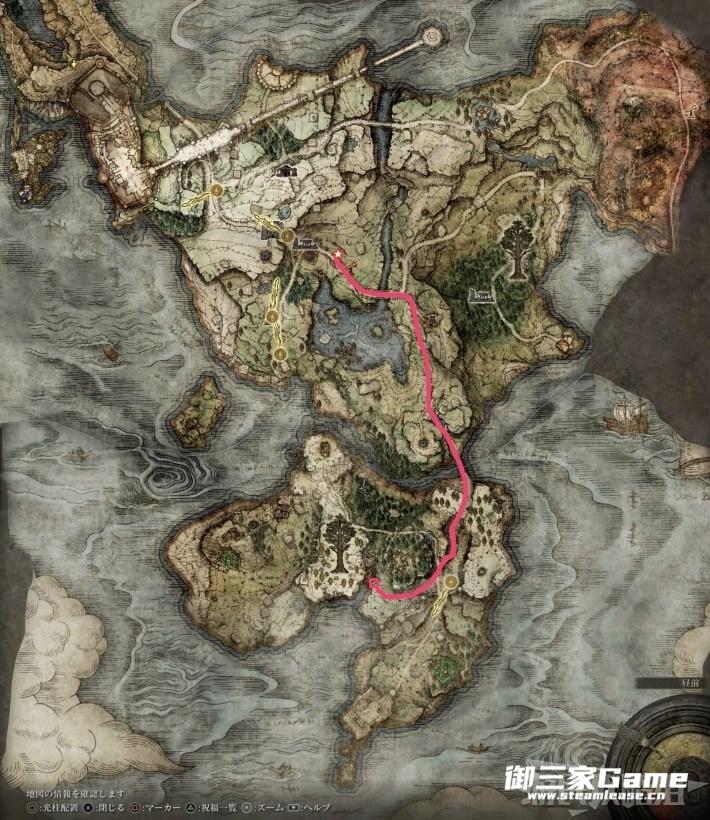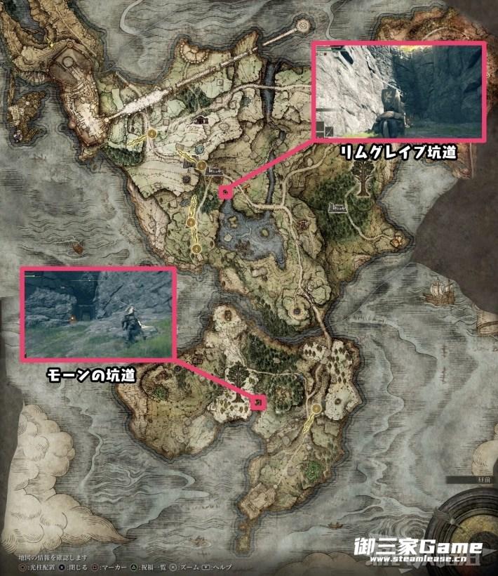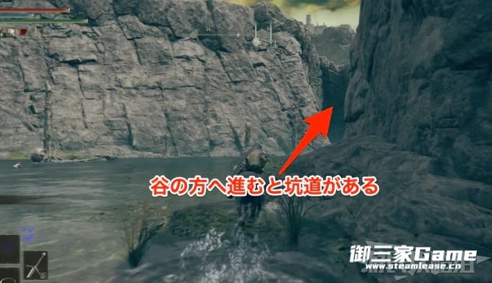 首先移动至坑道所在的山谷上。如果已经激活赐福点「摩恩城(城墙前方)」的话,可以直接从此赐福点传送过去,如果没有激活的话,可以参考下方图中路线前往。
