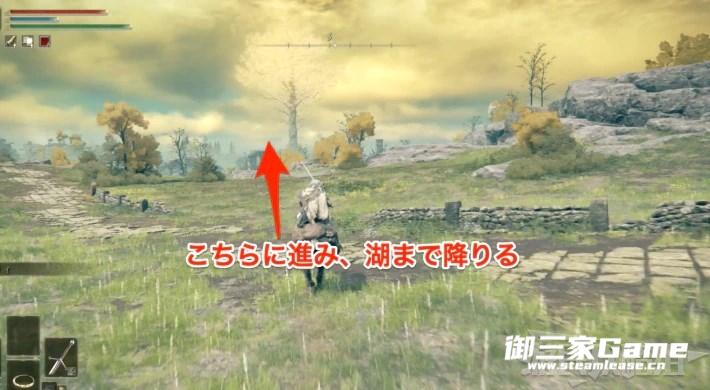 先前往赐福点「亚基尔湖北方」,然后再往南走,不要直接跳。往下方图2所指方向前进,到湖边往下跳。