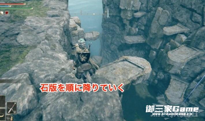 到达山谷上方时可以在悬崖旁边看到一些凸出的石板,按顺序依次踩着石板往下跳。注意骑马往下跳有时候容易跳过,有些距离较近的石板需要调整好角度,最好下马跳。