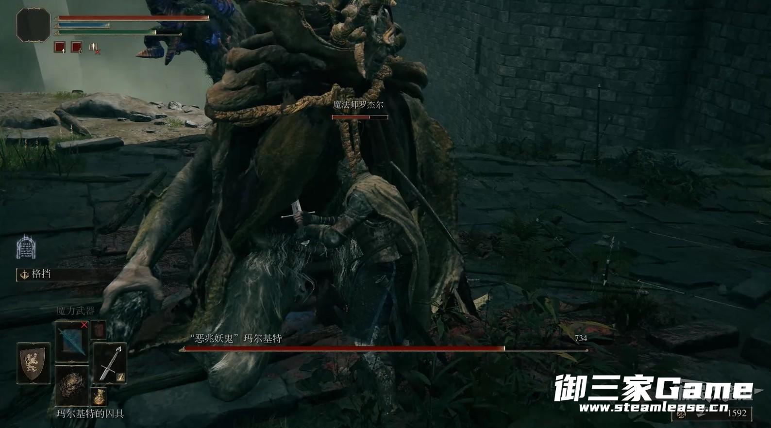 先让魔法师罗杰尔吸引恶兆的注意力,你在背后可愉快偷袭。“玛尔基特的囚具”可以把恶兆按在地上揍,不过在一次战斗中只能用两次,抓紧机会都先用了。