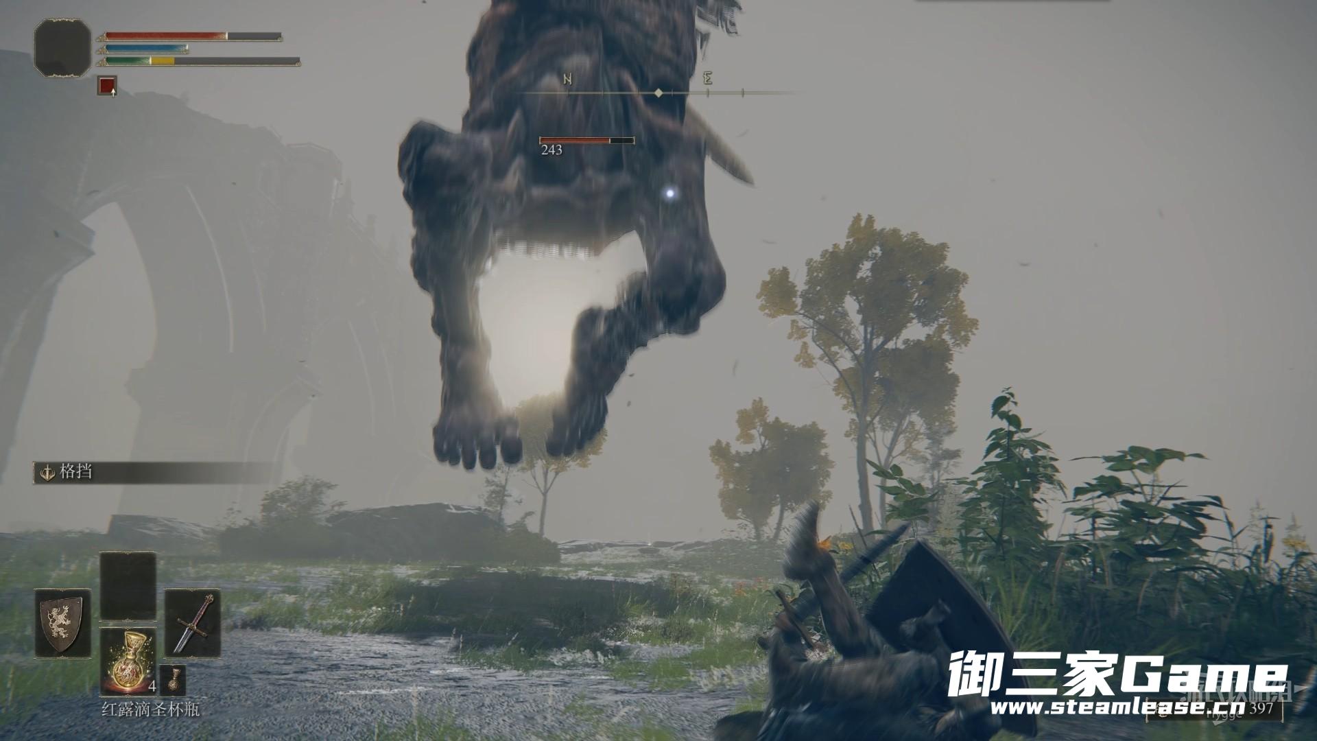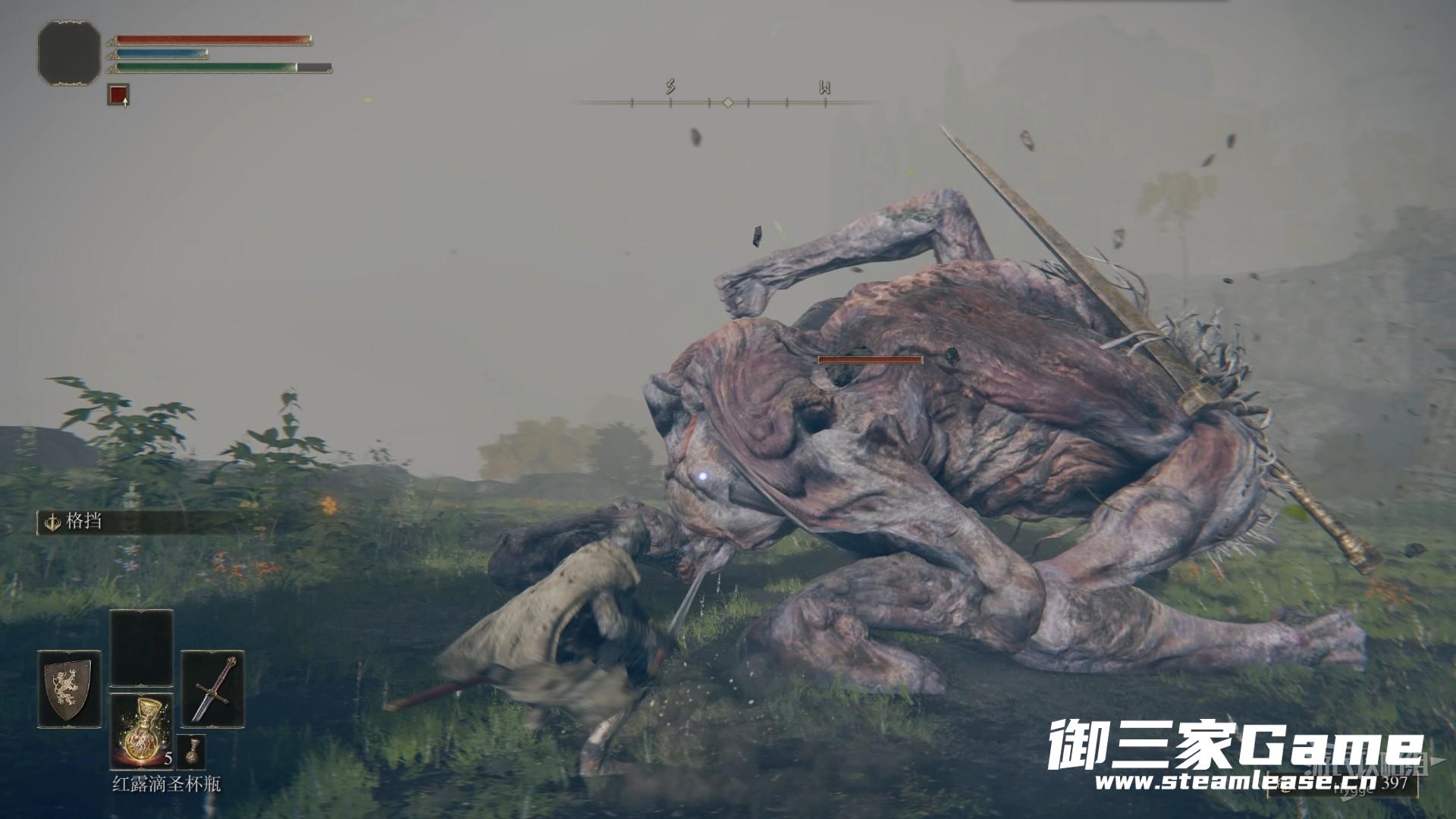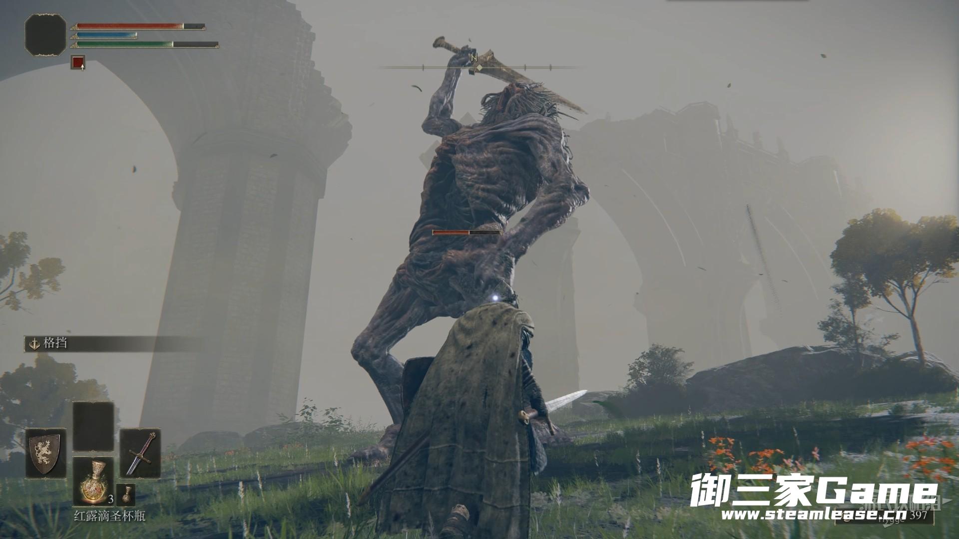 巨人先用左手横扫,随后将巨剑插向地面。