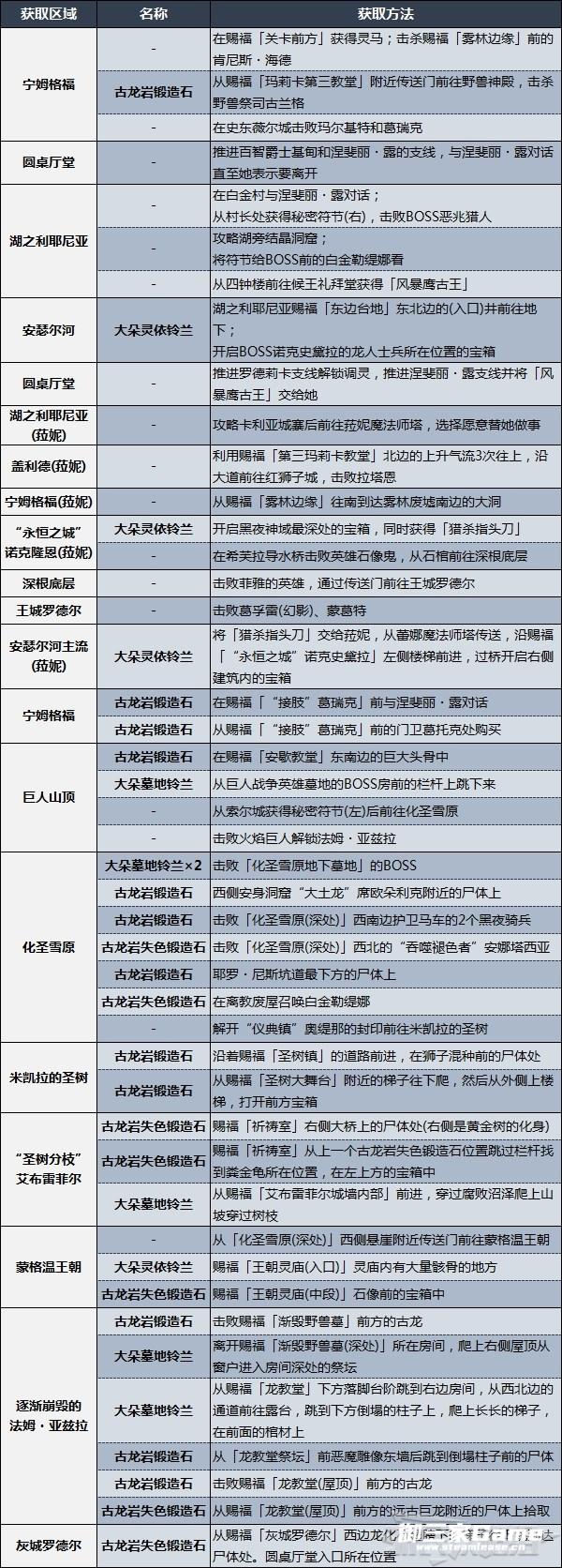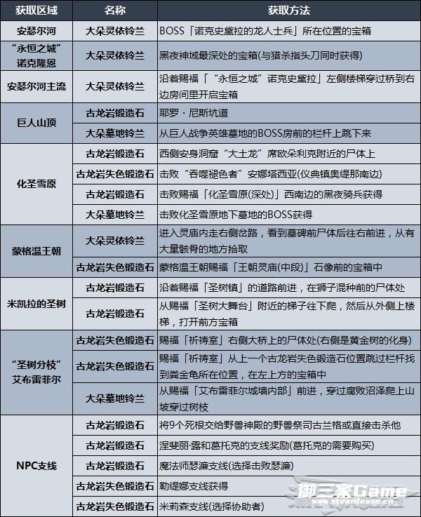 大多数武器需要多周目才能双持(这里的双持指的是两手各拿一把相同武器)。通过追忆兑换的武器,在新周目可以重复兑换;古龙岩锻造石、古龙岩失色锻造石、大朵墓地铃兰、大朵灵依铃兰、失力战灰、泪滴幼体在每个周目获取的数量是固定的,需求更多的话需要从新周目中获取
