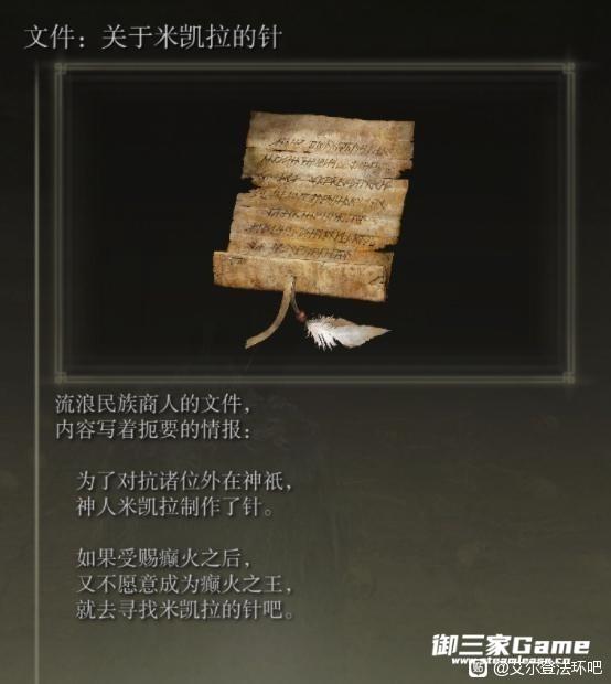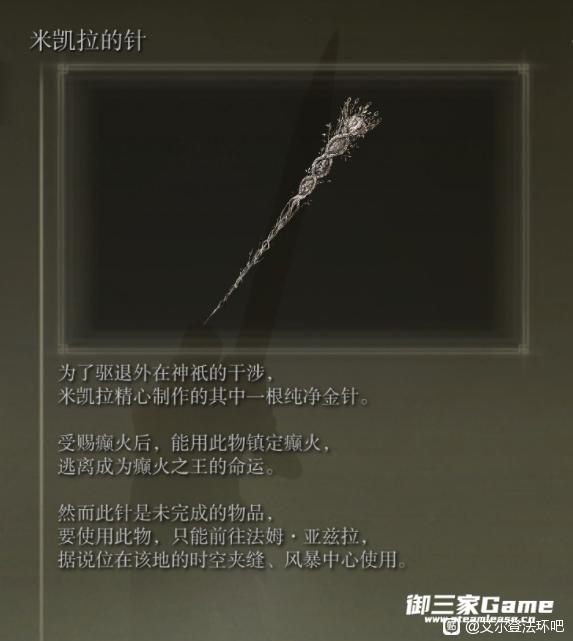 聪慧的米凯拉终于打造了一枚金针,可以有效的压制妹妹体内的猩红腐败,结束妹妹无尽的痛苦。万事俱备,只差最后一步。就是前往时空夹缝之中的法姆亚兹拉,在那里为玛莲妮亚插上金针就行。那么怎样才能过去呢? 通关的朋友们都知道,就是夺取大卢恩,燃烧黄金树,成为艾尔登之王!