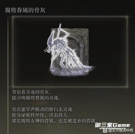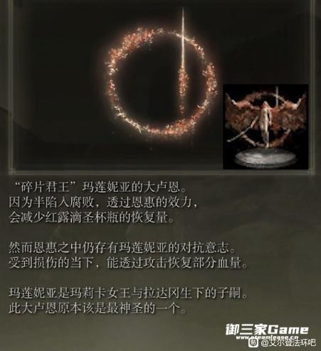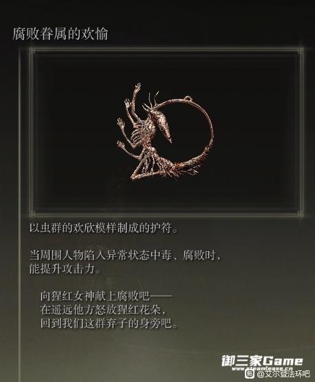 而妹妹玛莲妮亚则更加不幸,生来就四肢残缺。且没有专属的律法。游戏内也没有明确文件指出玛莲妮亚具有任何与生俱来的强大力量。 但是有一位外神,被封印在腐败湖的猩红腐败女神看中了这位不幸的姑娘,将猩红腐败放入了她的体内。目的是培养出他们所谓最美的花朵。让腐败的律法取代黄金树。这一点腐败湖和格威的支线已经说的很清楚。 猩红腐败女神是自古就存在的古神,想要用自己的腐败律法取代黄金树。蘑菇人和皮皮虾都是她的粉丝和眷属。