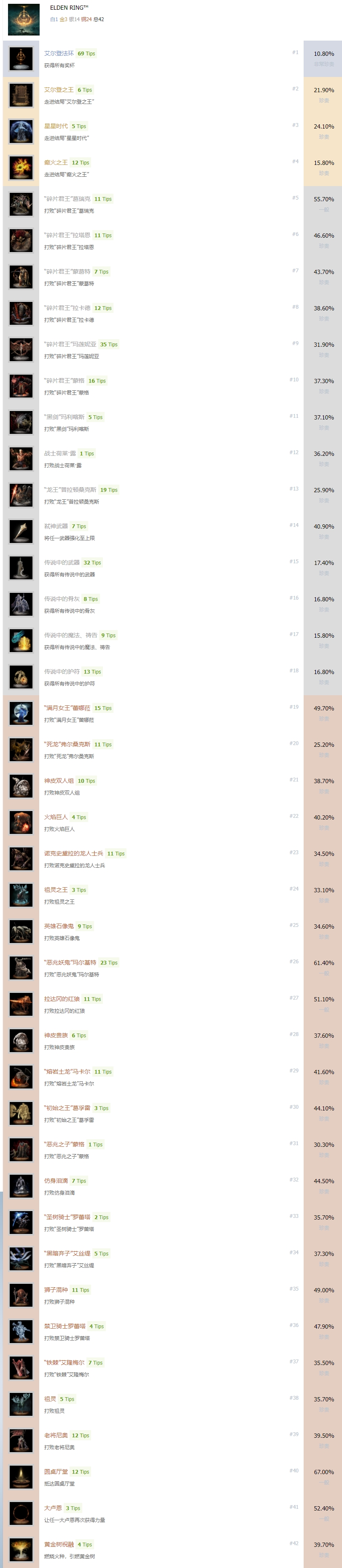 《艾尔登法环》共有42个奖杯,其中包含24个铜杯,14个银杯,3个金杯和1个白金奖杯。下面为大家带来《艾尔登法环》中文奖杯列表一览,希望对大家有用。