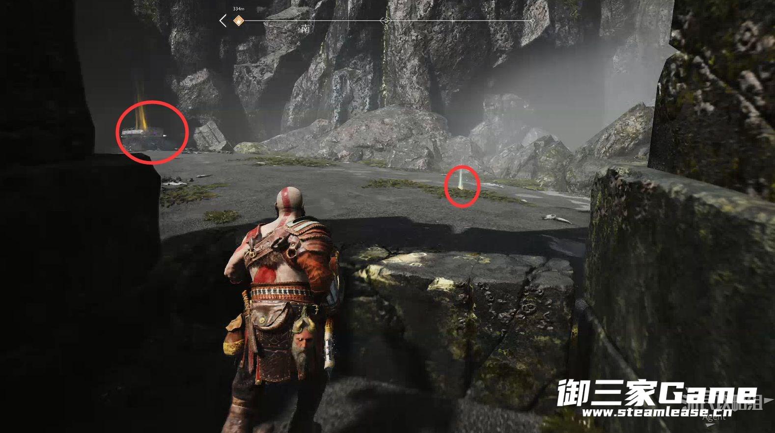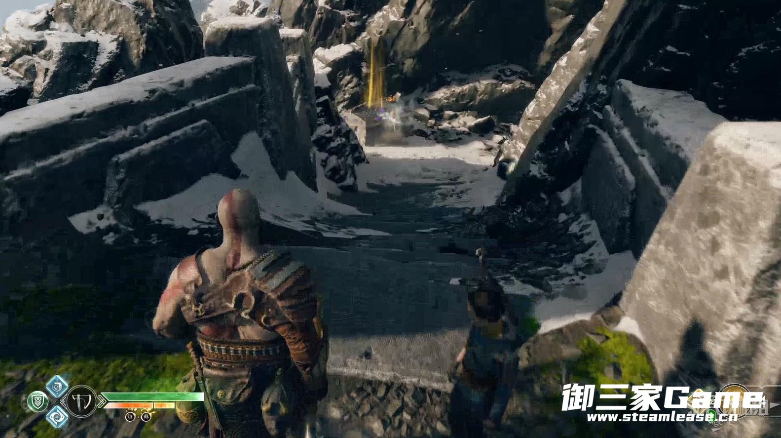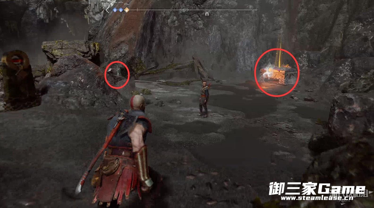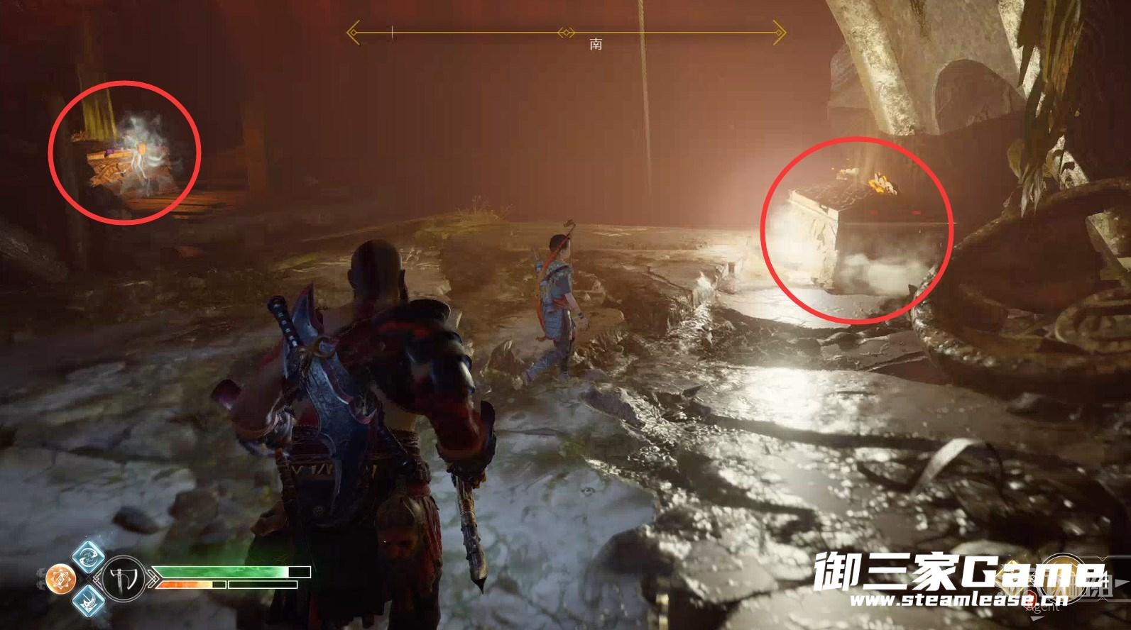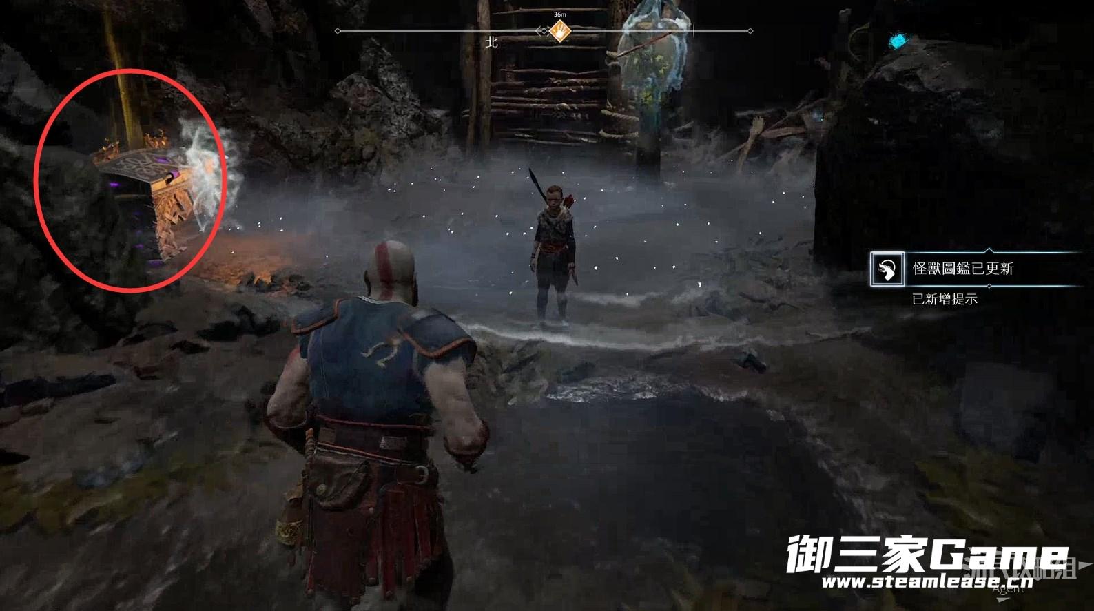 九界之湖,渡鸦断崖。巨型怪物尸体旁,击碎木板,送阿特柔斯上去放下铁链,爬上去拿到【符文对照盘碎片宝箱】。