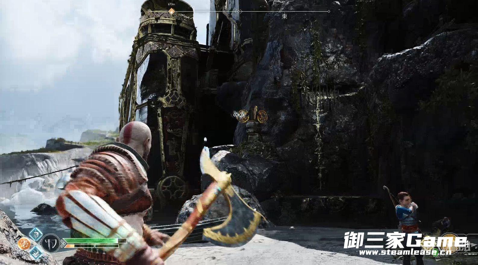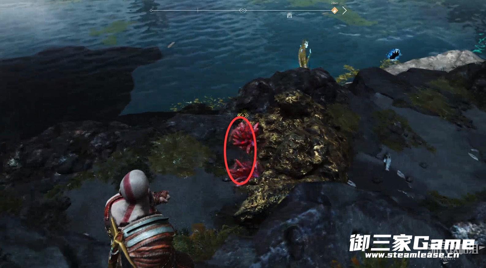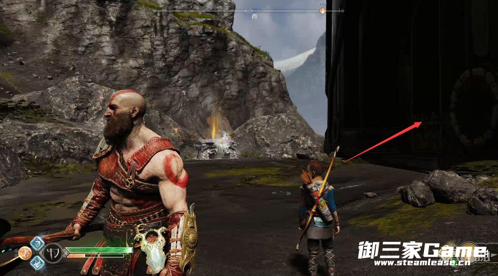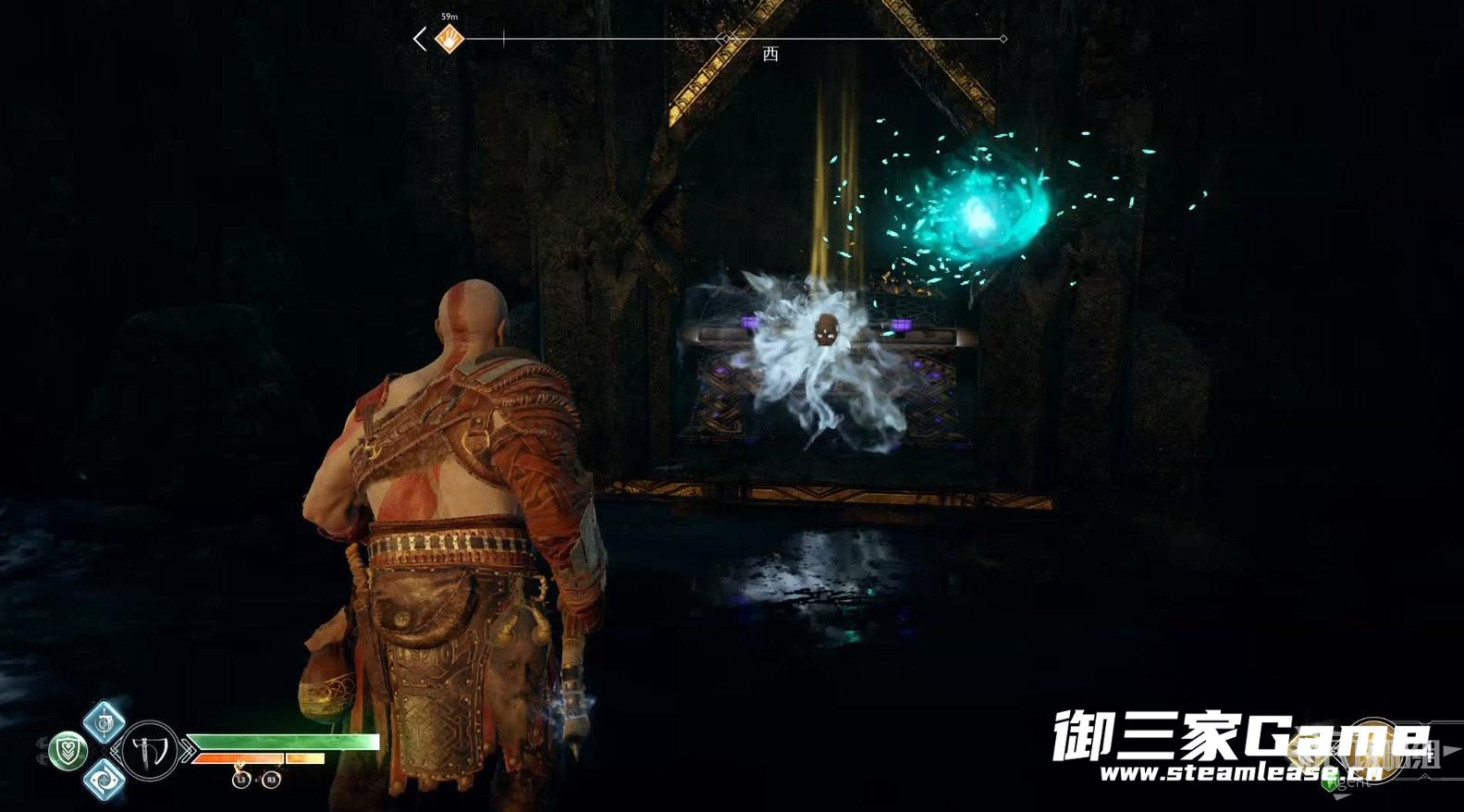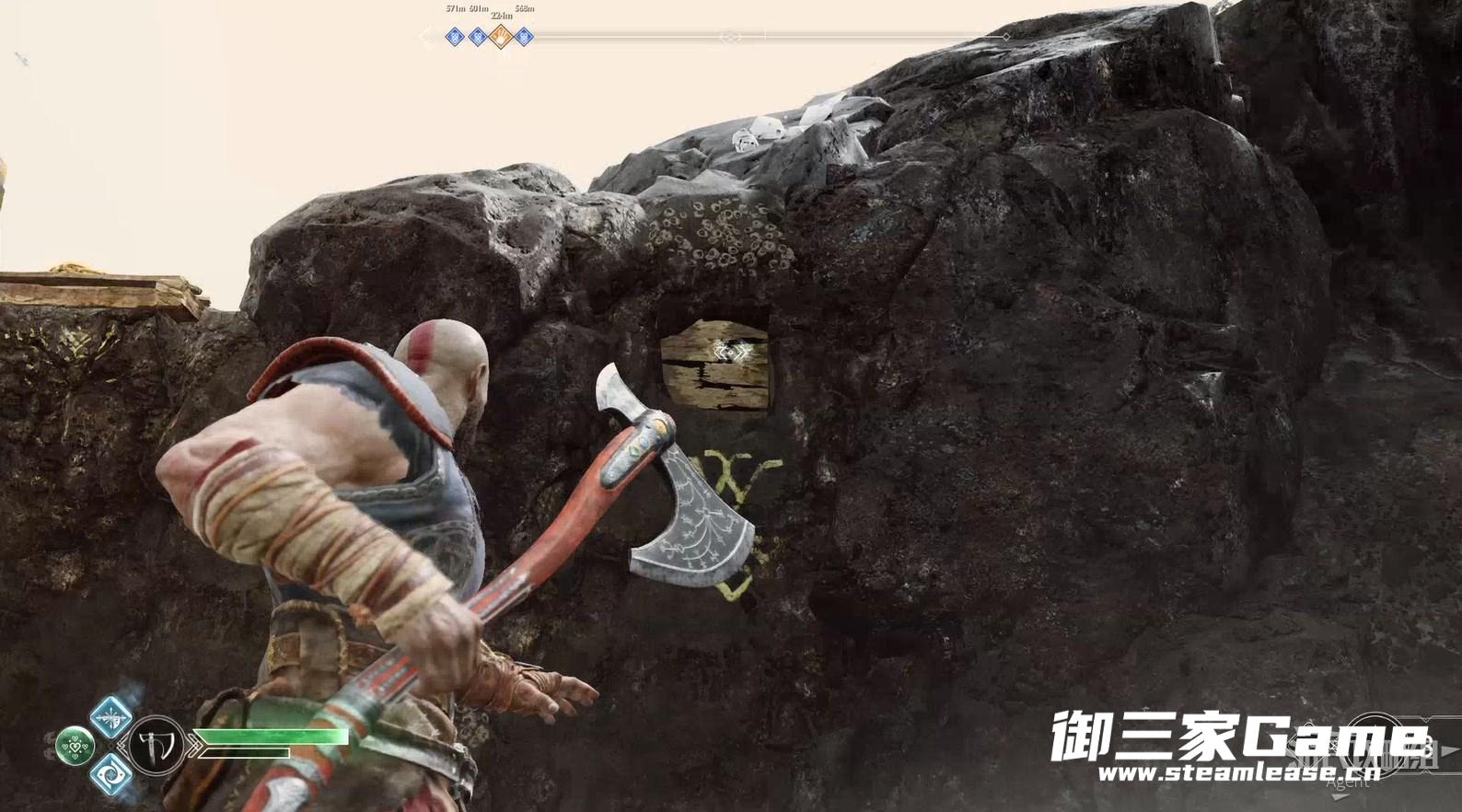 九界之湖,渡鸦断崖。巨型怪物尸体旁,击碎木板,送阿特柔斯上去放下铁链,爬上去拿到【符文对照盘碎片宝箱】。