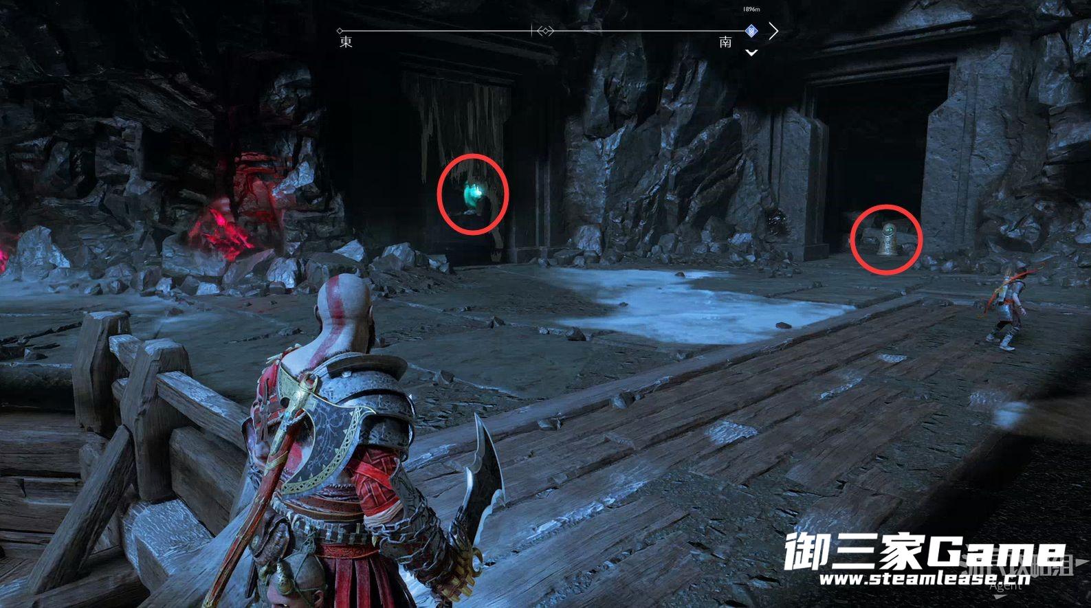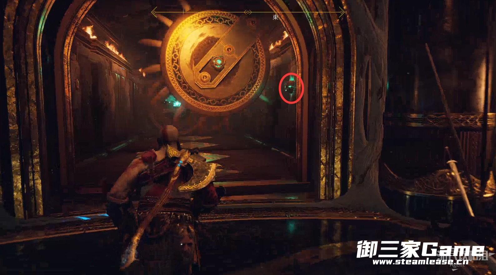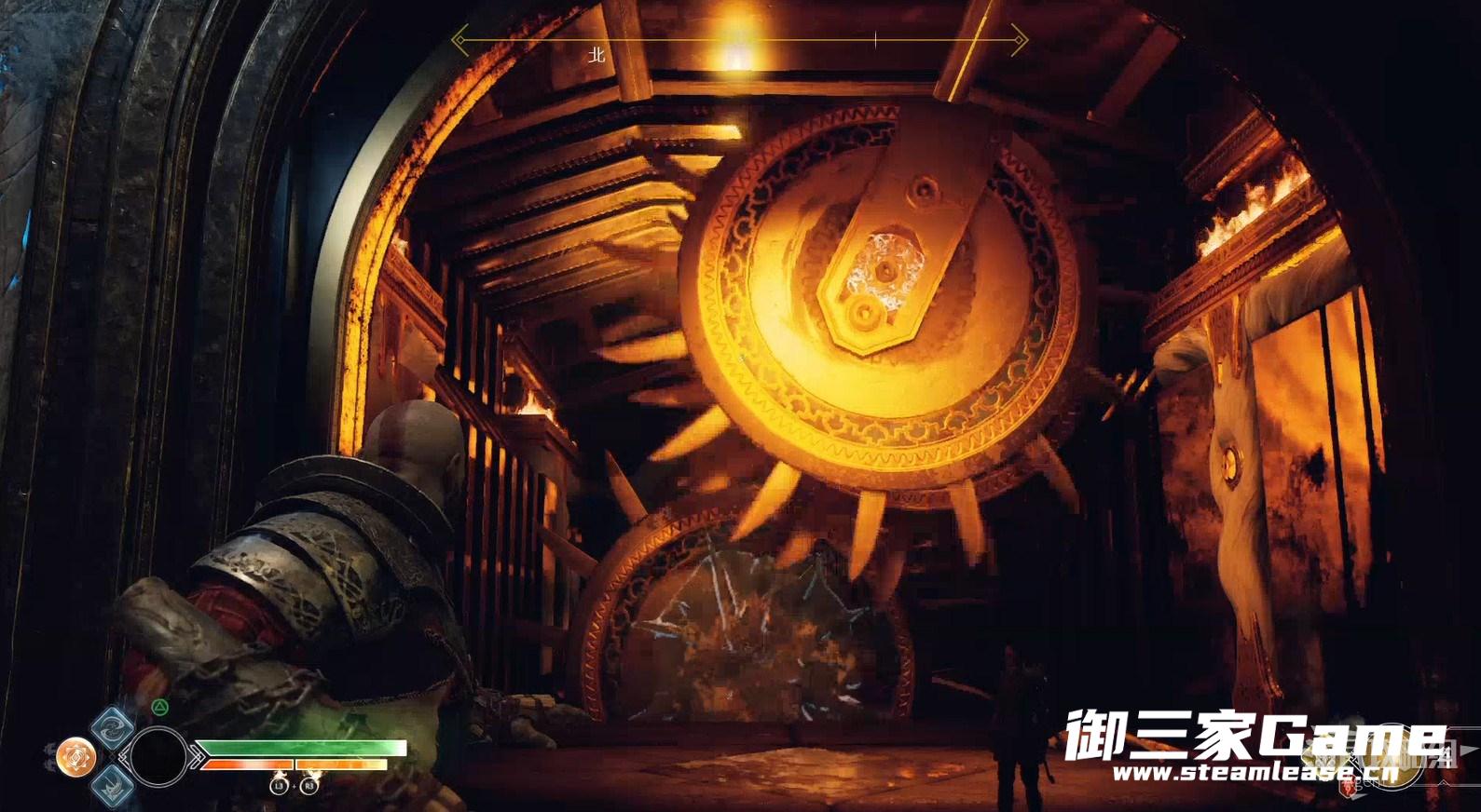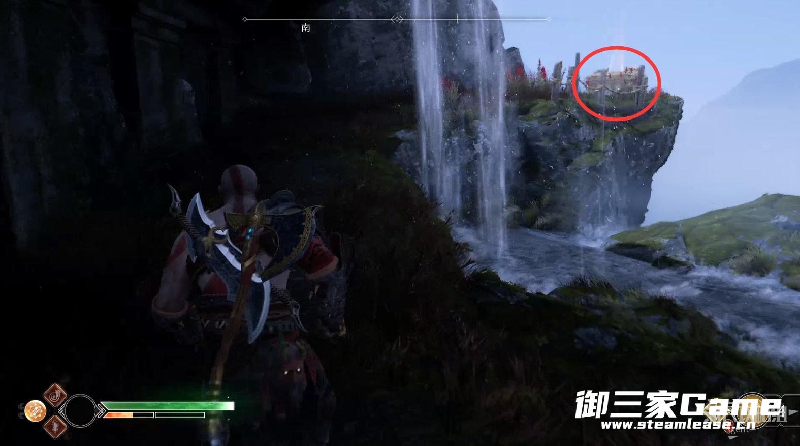 2、赫尔海姆获得捕风能力后,主线“回到山顶”,乘电梯上来后,送阿特柔斯上去放下铁链,上面的门里有个怪,还有个需要赫尔之风打开的机关。