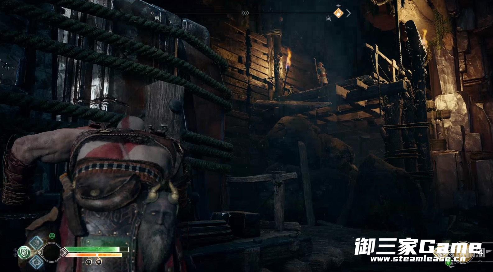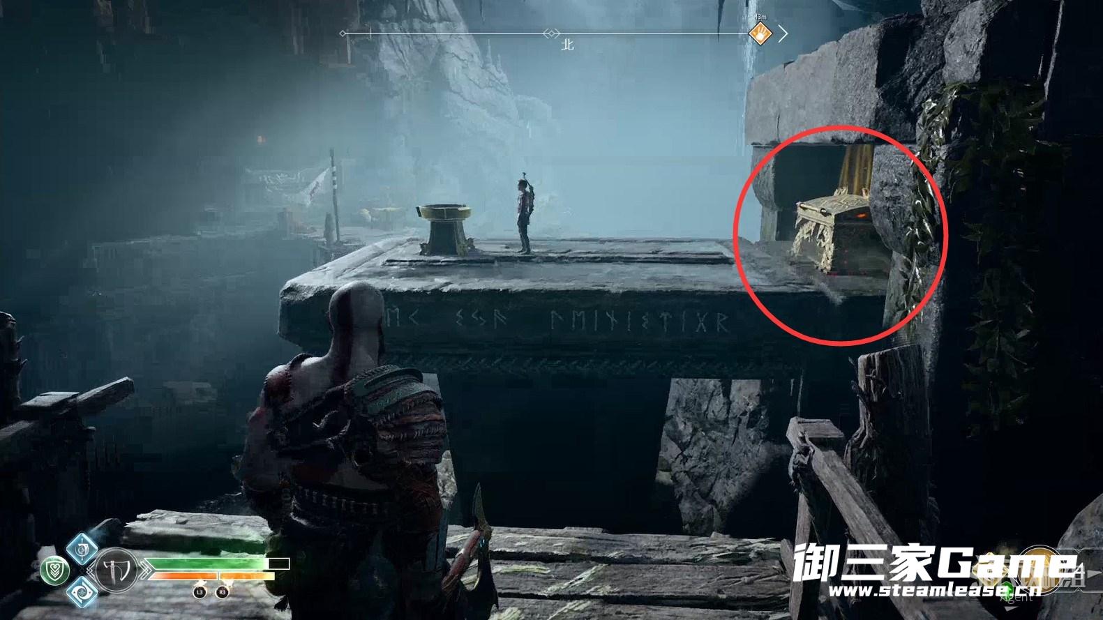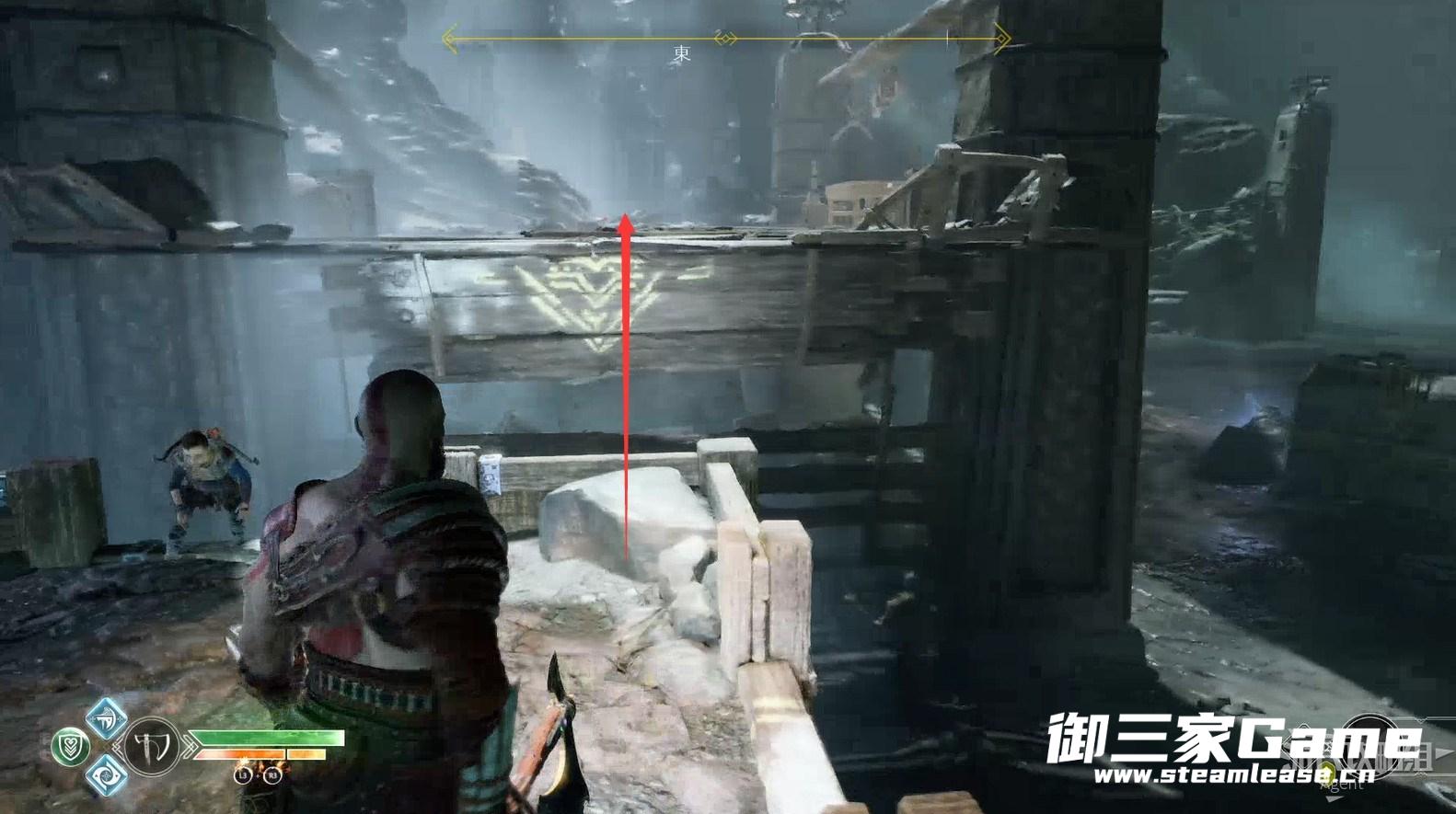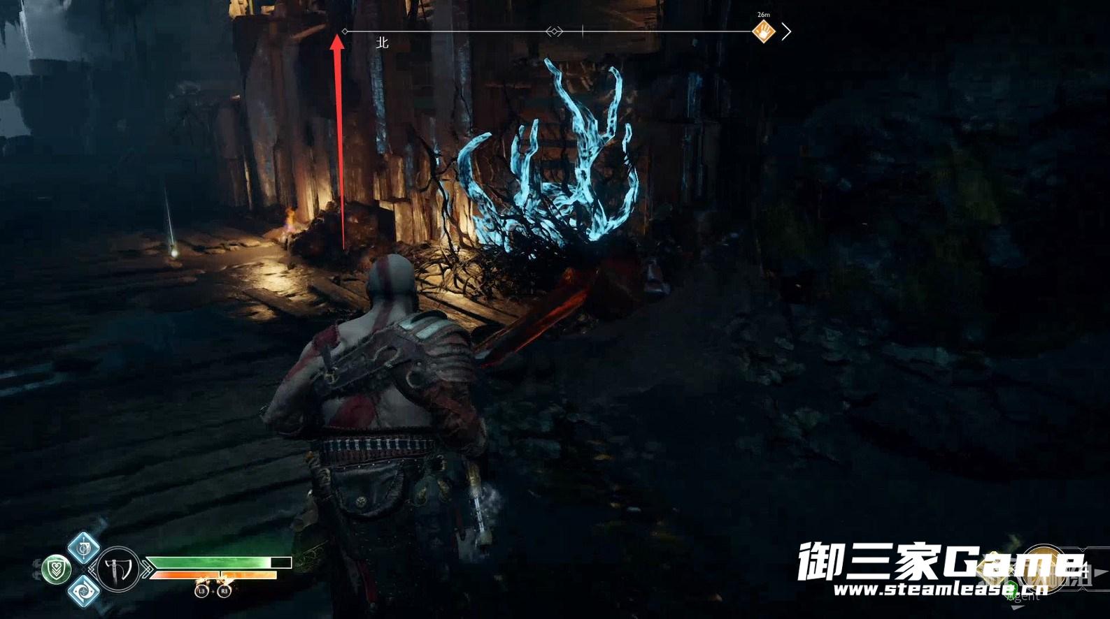3、新的目的地-河口,回到女巫洞穴,打开奥丁密室旁的门继续探索,从这里送阿特柔斯上去。(旁边的黑色藤蔓等拿到混沌双刀后才能摧毁,到时老父亲也能爬上去了)