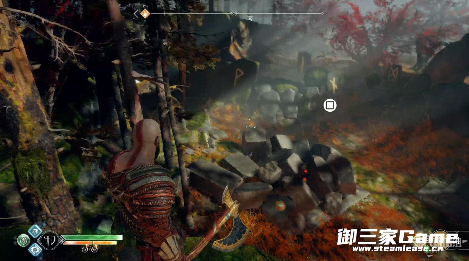 4、新的目的地-河口,从井口爬上来,来到女巫花园,站在高处,让阿特柔斯识别符文。