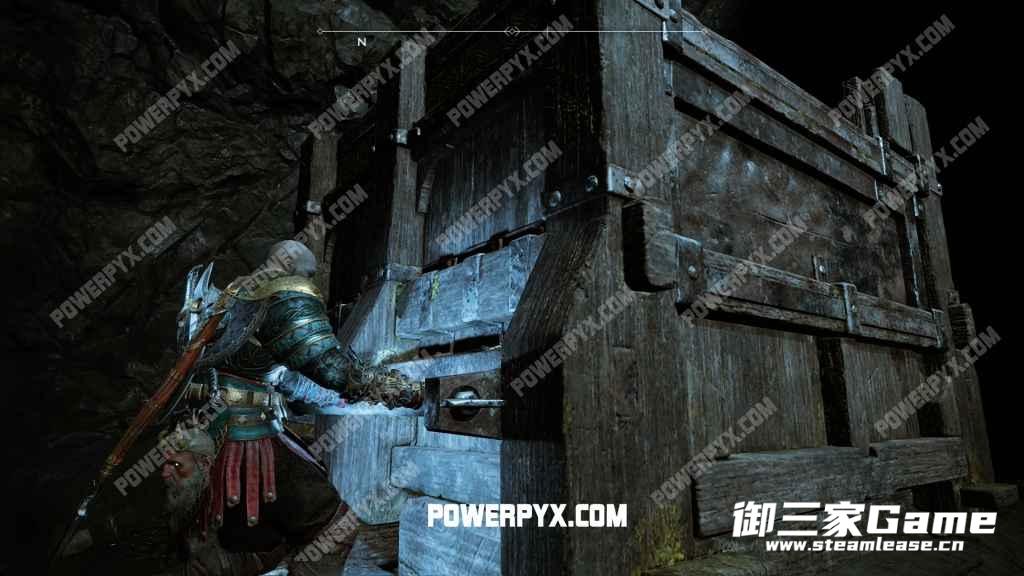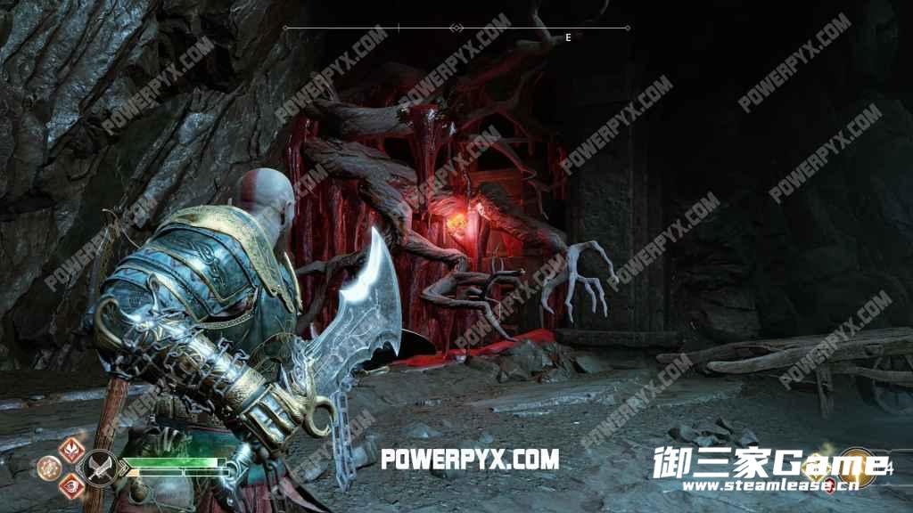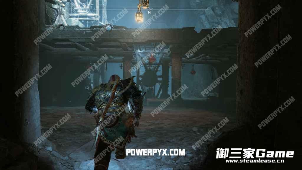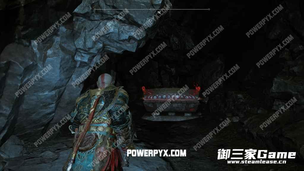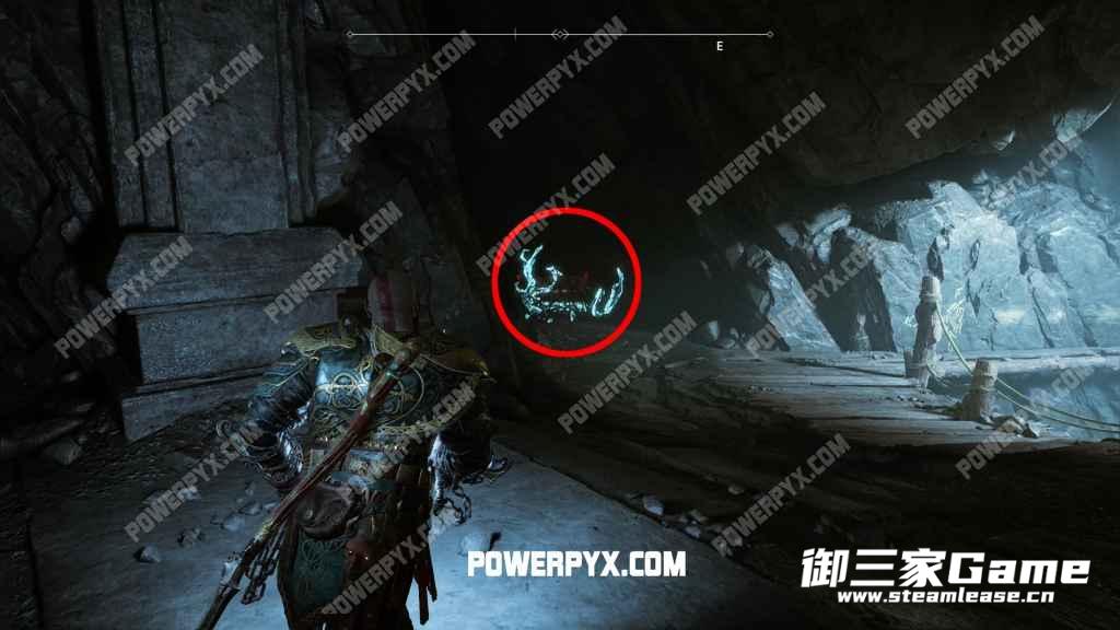 找到上一件装备后进入深山中,来到下方图1所示位置,上方是一座桥,桥的下方可以通行。房间另一边有红色结晶(爆炸物),用红色结晶炸开大门,门后有一辆矿车,把它拉到区域中央,爬到上边并打开宝箱即可获得【神话清晰战争腰带】。
