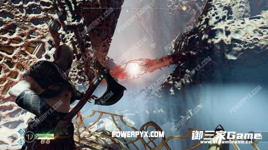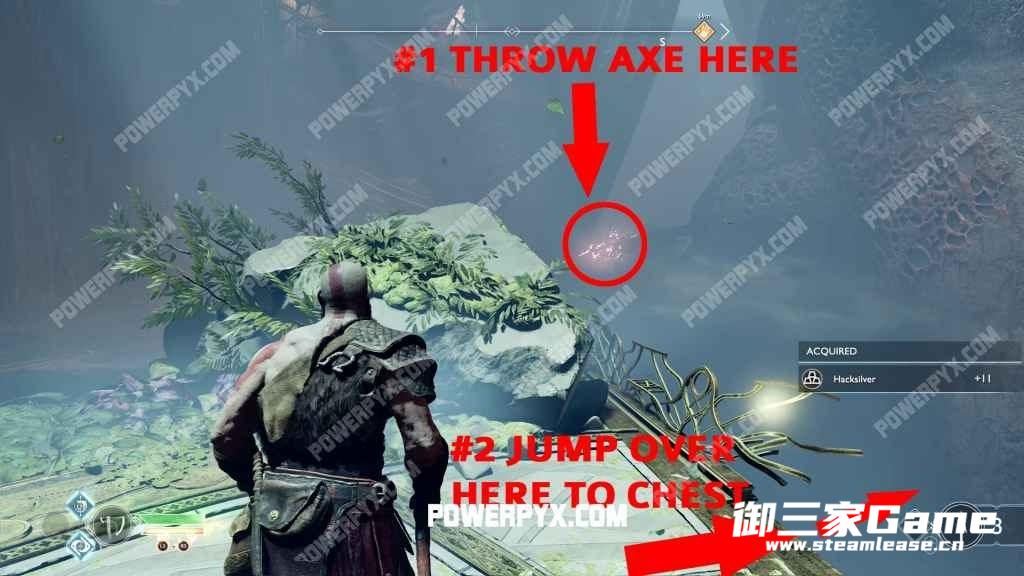 转身爬到上边去,然后收回斧头,平台上升,然后就可以打开宝箱拿到【卢恩符文前臂套】了。