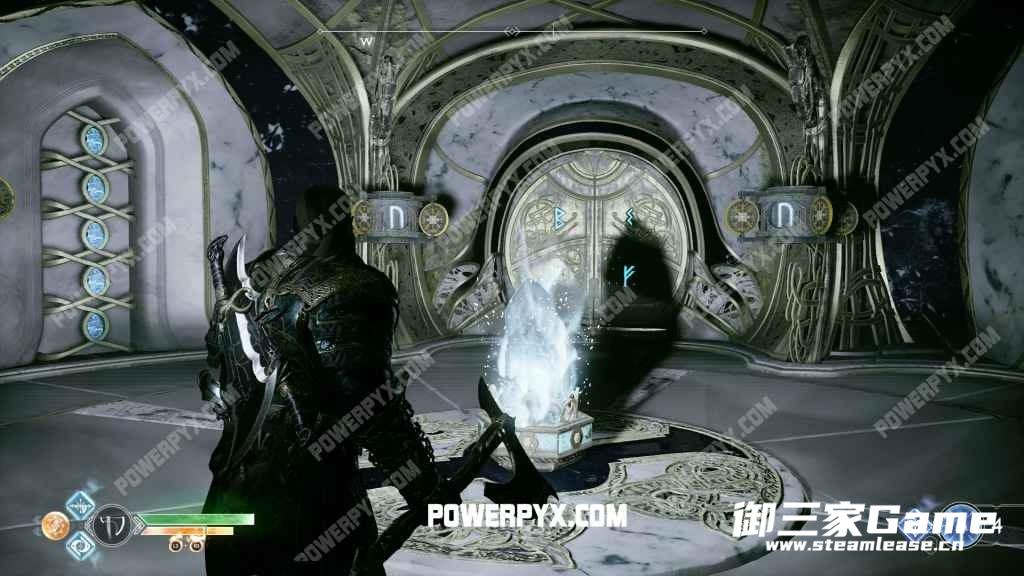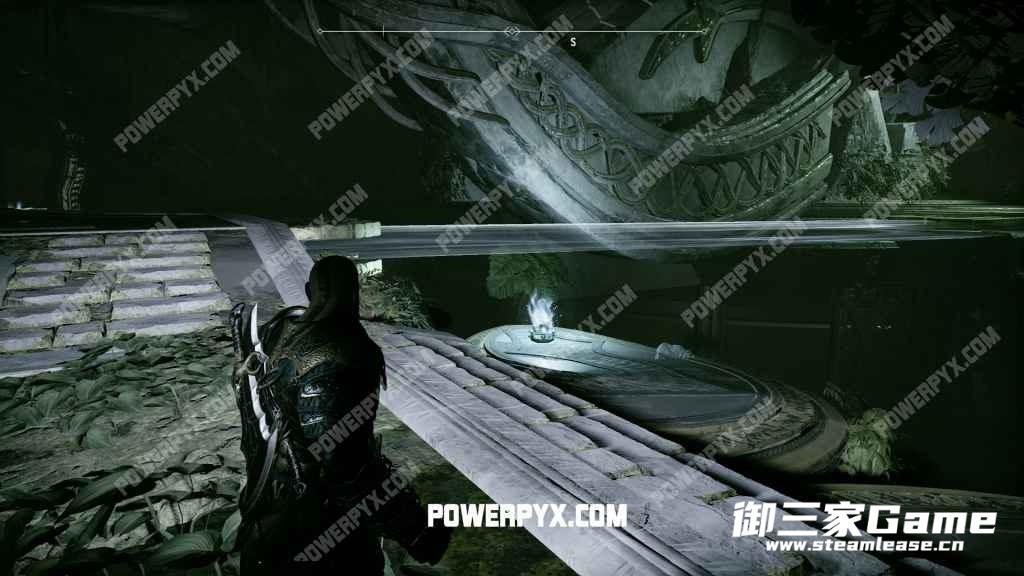 往前面走,途经一个“诺伦三女神宝箱”后找到轮盘,转动轮盘使中间平台下降。