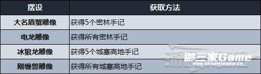 从各个地图中收集古老手记,交给埃尔迦德的NPC「胧」后可以获得雕像雷摆设。