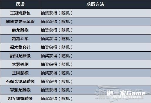 在特定期间于杂货店抽奖也可以获得摆设,抽奖需要消耗抽奖券。注意抽奖的奖品是随机的,会包含《怪猎崛起》本体的摆设,若之前本体的摆设没有全部获得的话,本次抽奖就有概率抽到本体的。下方列出部分奖品。