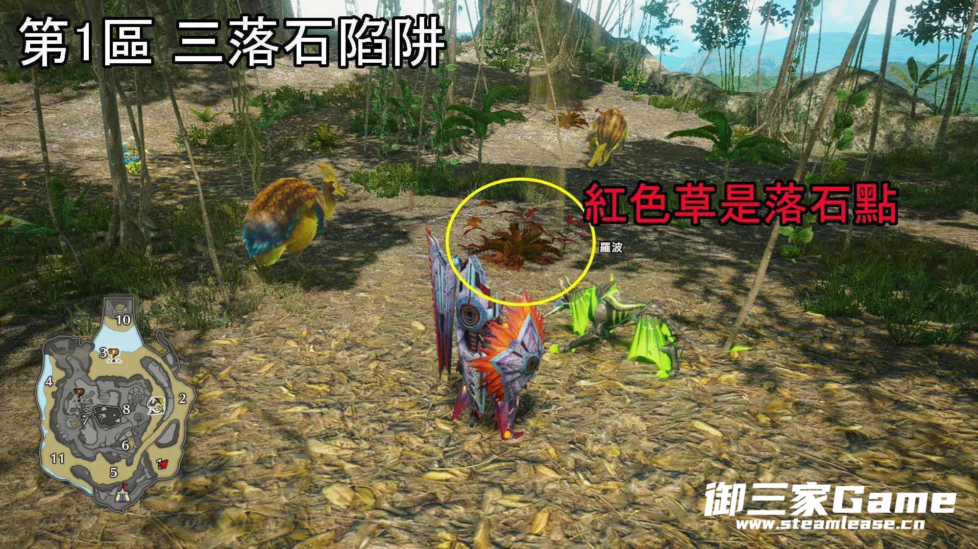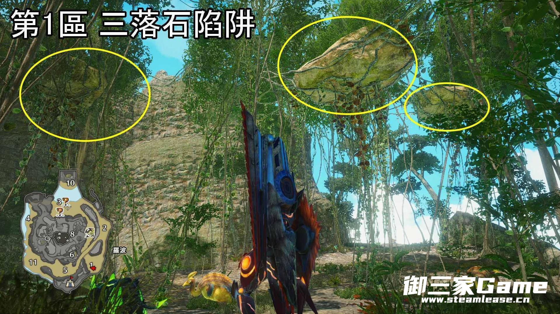 第1区有三个落石陷阱,可以透过苦无、弓箭矢、轻重弩子弹来射击触发,要注意操虫棍的操虫和印弹在DEMO版是没办法触发的。