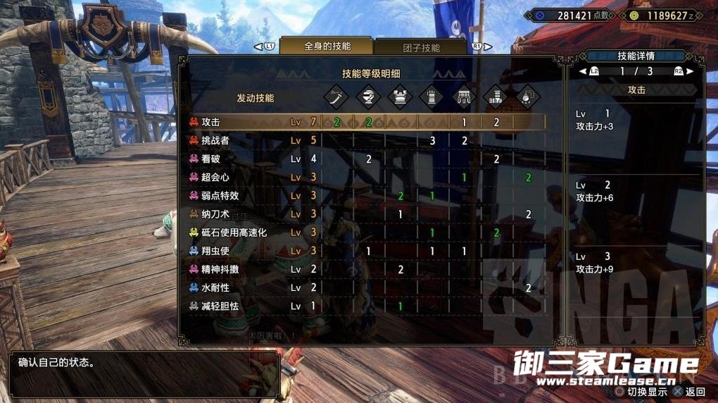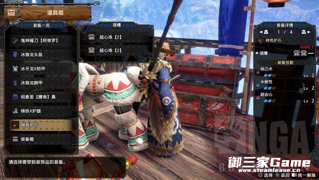 技能没有配什么连击和合气之类的,比较朴实无华,下面是配装。护石纳2S22是太刀的标配了,不算很难获取