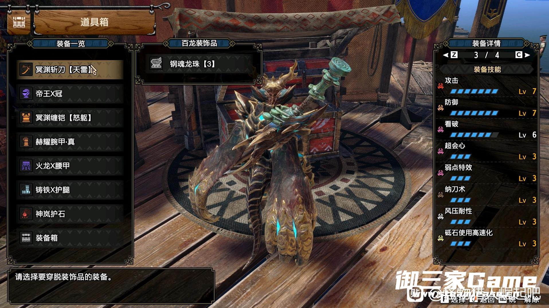 技能根据自己的护石取舍一些就行了,用达人弥补冥渊太刀的-25会心,插一颗钢龙魂百龙珠(钢龙魂连续攻击目标提升会心最高第三刀能提到30左右)再带上一只战斗猫可以满会心,天慧手还带一个四级孔,打完G位角龙以后可以解锁5级防御珠,再插两个1级防御可以7级防御!