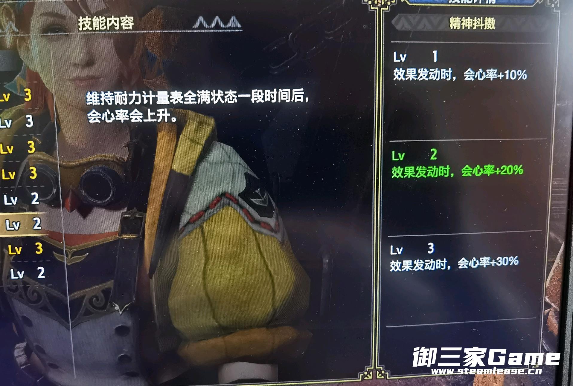 另外激昂二级还可以搭配精神抖擞三级,精神抖擞在满耐力的情况下会提供30%的会心,搭配激昂是一个相当强势的技能,要知道看破6级也才能提供30%会心。