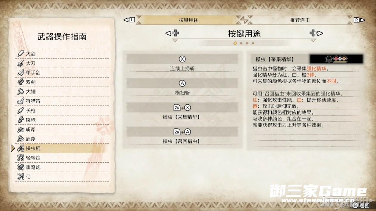 玩家可以通过+键打开菜单,在信息一栏的猎人笔记中找到武器操作指南,详细查看当前使用武器的攻击方式和特殊能力等。