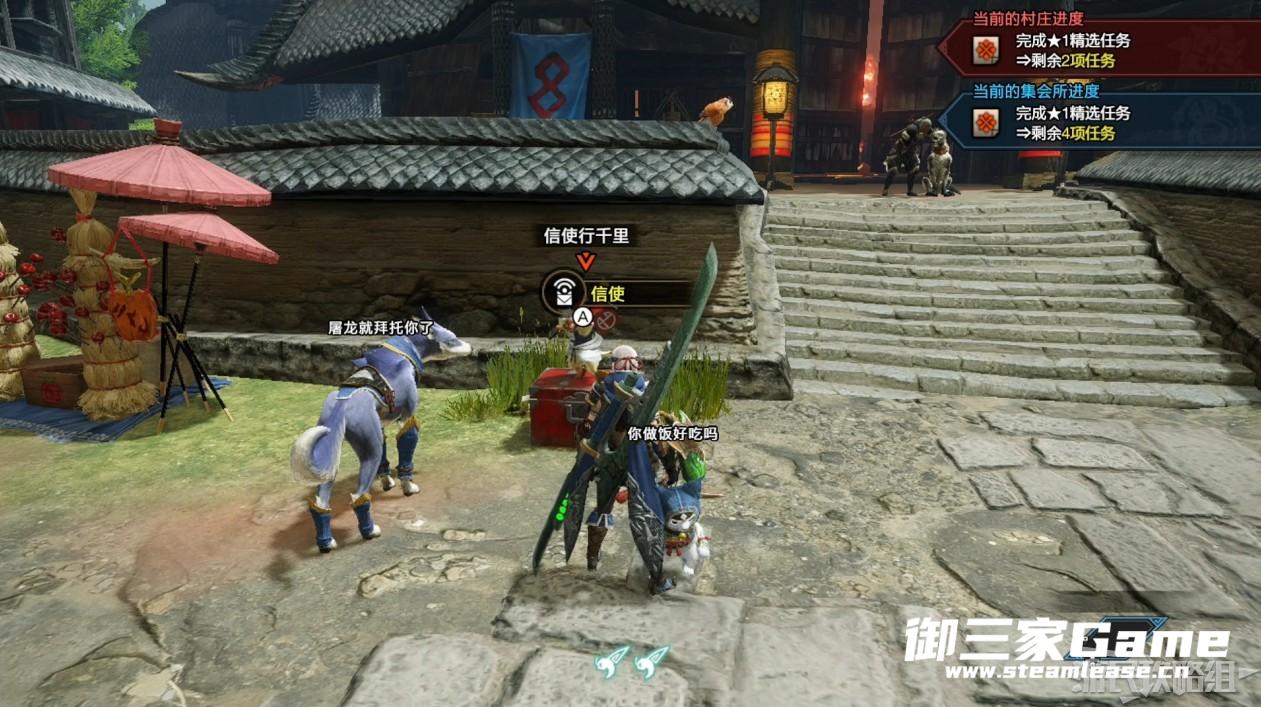 村长右手边的NPC为信使行千里,玩家可以在该NPC处接收邮件、与其他玩家联机组队等。