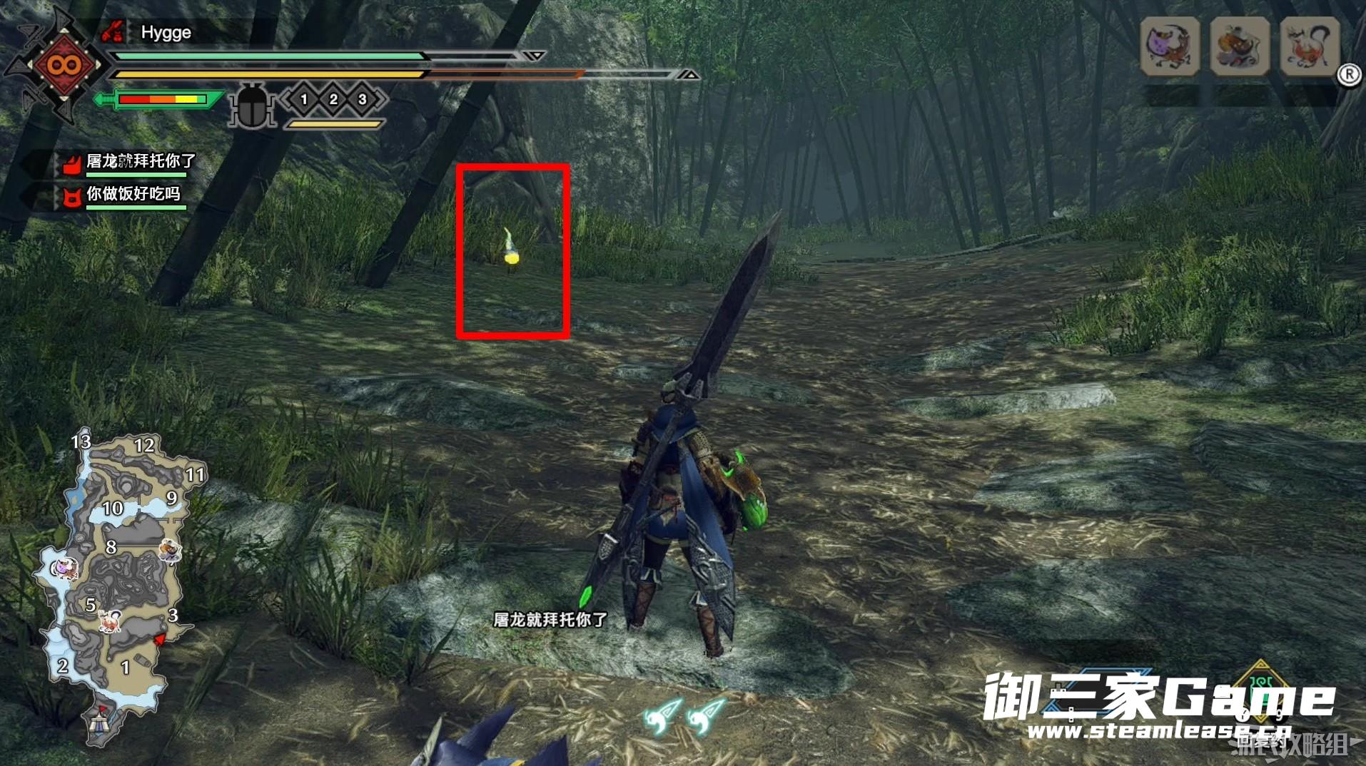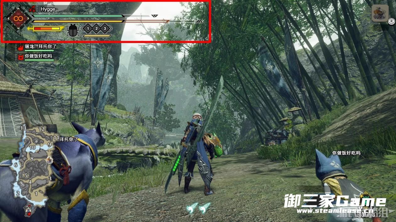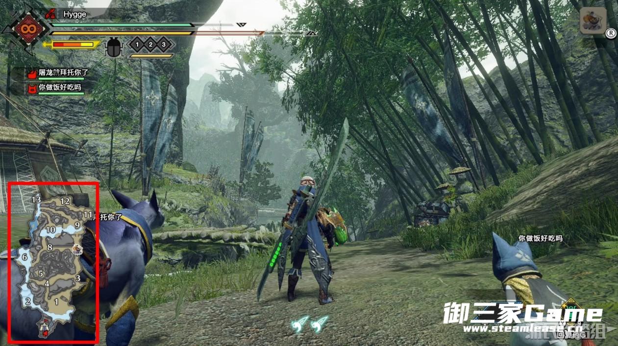 界面左下角为小地图,玩家可以在此处查看玩家、大型怪物和任务目标所在位置。