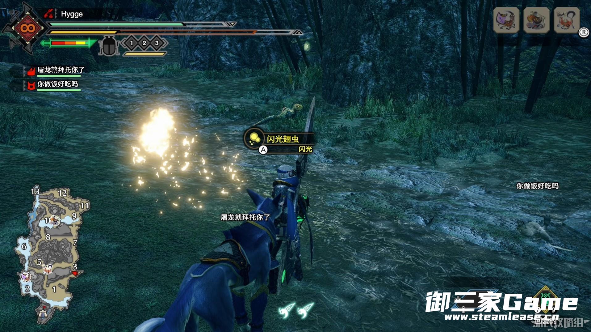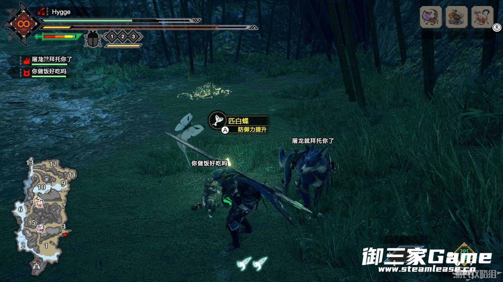 首先持续强化生物以鬼火鸟为主,在靠近鬼火鸟后可以将其吸收以获得各种强化效果,持续强化生物顾名思义,获得的强化效果会在本次任务一直生效直到任务完成。不同颜色的鬼火鸟有不同的加成效果,红色、橙色、绿色和黄色分别提供攻击力、防御力、体力和耐力加成。我们可以在开始任务后首先手收集持续加成生物,提高自己角色的强度后再正式开始狩猎。