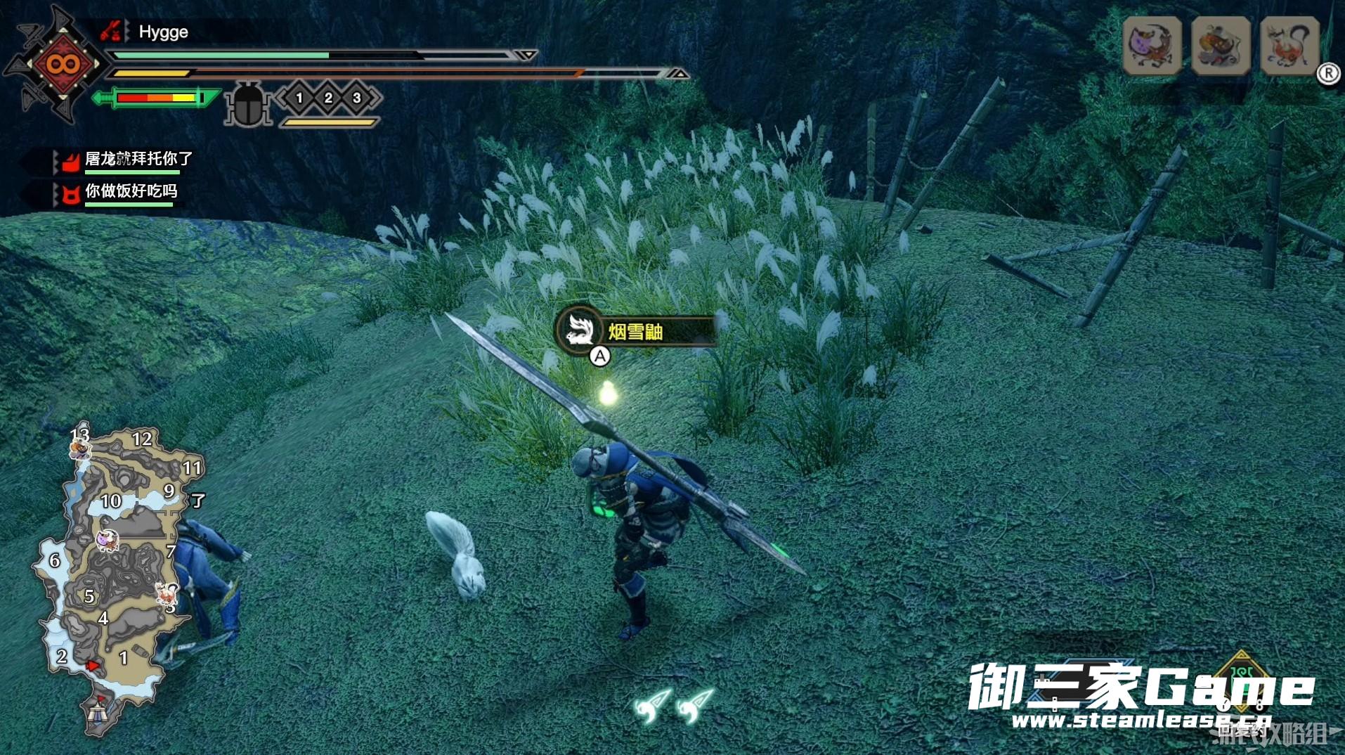 在关卡界面中左上角显示玩家当前的状态。绿色和黄色条分别为体力和耐力值,当玩家受到怪物攻击后会损失体力值,当体力值为零时玩家会被送至营地复活,通常情况下每次任务每位玩家有三次复活机会。