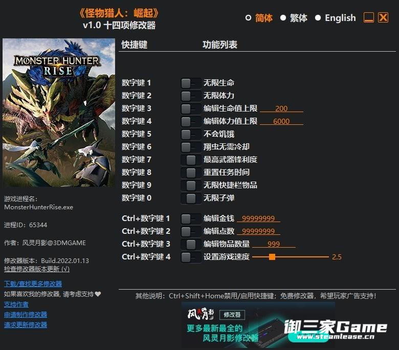 《怪物猎人崛起》是怪物猎人系列的最新续作,因为游戏有着一定的难度,不少玩家想要使用修改器来体验游戏,下面请看“风灵月影”带来的《怪物猎人崛起》PC版修改器及使用方法说明,希望能够帮助大家。