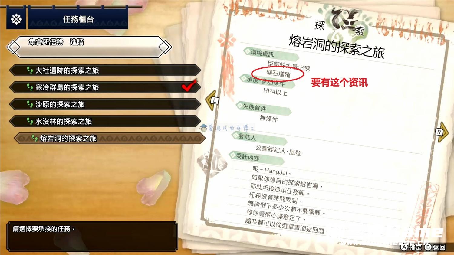 然后,我们就可以去做上位的熔岩洞或寒冷群岛自由探索任务,这些任务只要完成了该地图的任意上位任务就会开放。
