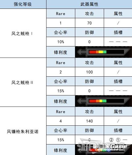 镰鼬龙长枪的各强化等级属性如下。