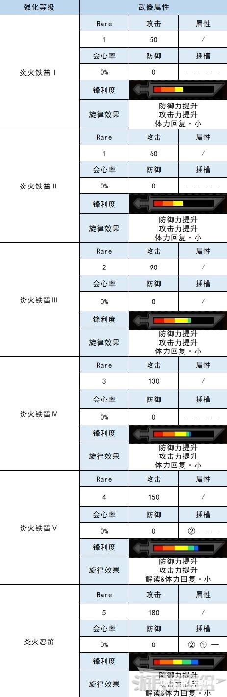 炎火狩猎笛的各强化等级属性如下。