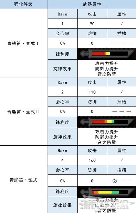 青熊兽狩猎笛的各强化等级属性如下。