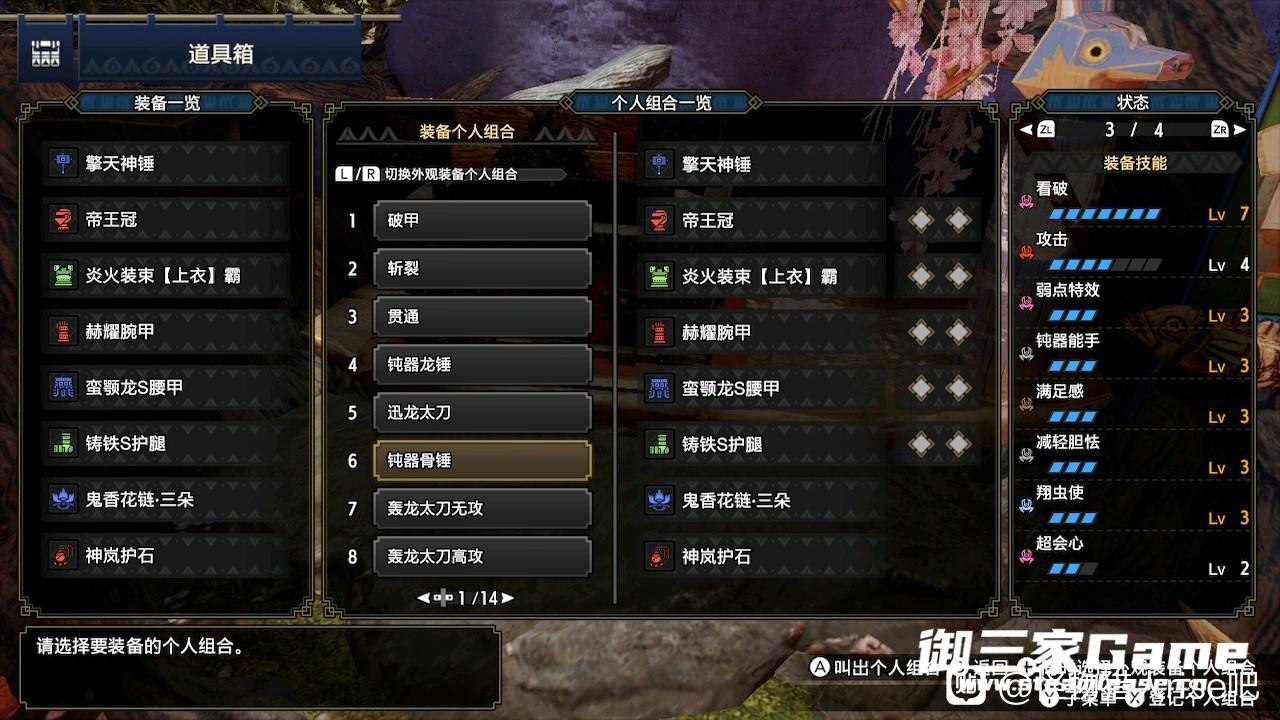 为什么不选金狮子大锤?擎天神锤攻击和金狮子一样,还不是负会心,绿斩也超长,完全不用磨刀。这套吃药天地打冲撞打变红爆麟龙头能上1400-1500,钝器这套感觉比轰龙强多了。