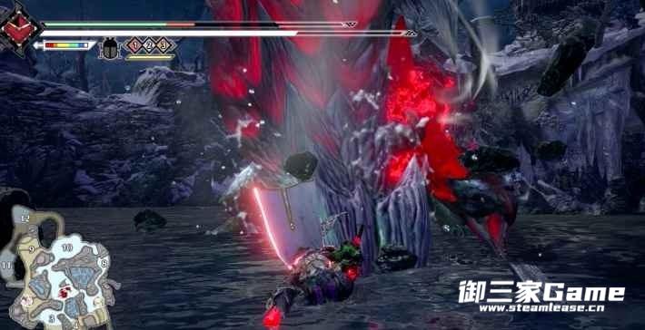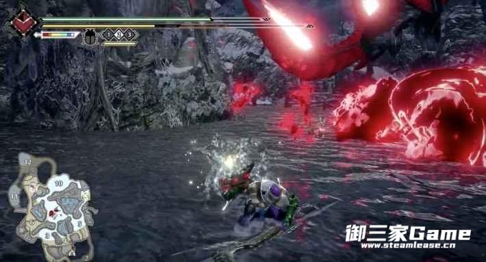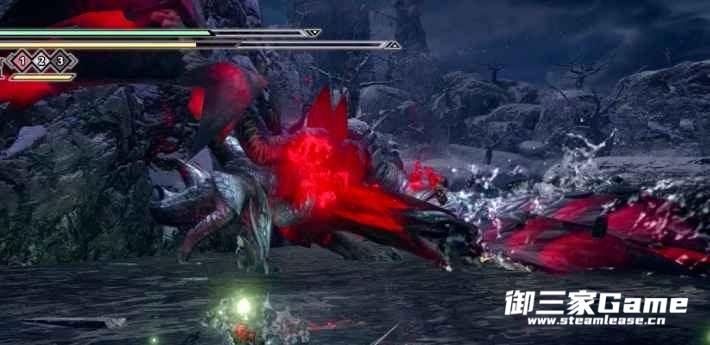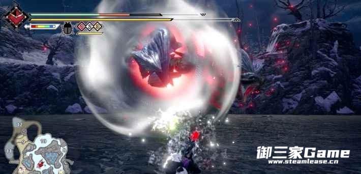 同时要注意戳刺后会有一个大回旋,攻击范围较大,并且回旋开始和结束的判定都比较强,攻击盲区在它的身体下方,因此可以选择站在它的身体下方进行躲避,或根据地形的高低差也可以躲过(如下方动图所示)。