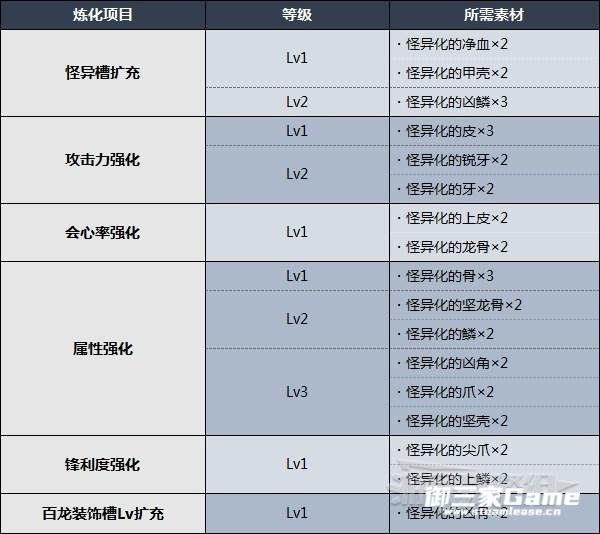 在对武器进行怪异炼化时,每个强化项目都需要消耗不同的怪异化素材,此外目前只有RARE10的武器可以进行怪异强化。强化所需的怪异化素材如下。