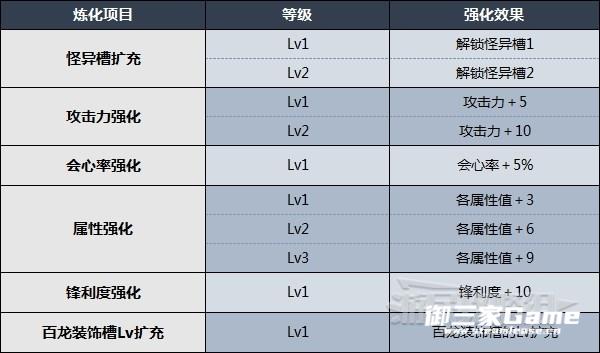武器的怪异炼化基于怪异槽数量,总共有5个怪异槽,其中2个需要通过「怪异槽扩充」来解锁。各强化项目存在等级设定,强化效果随等级提升而增加,但使用的怪异槽数量也会增加,这一点需要合理分配。怪异槽强化效果如下。