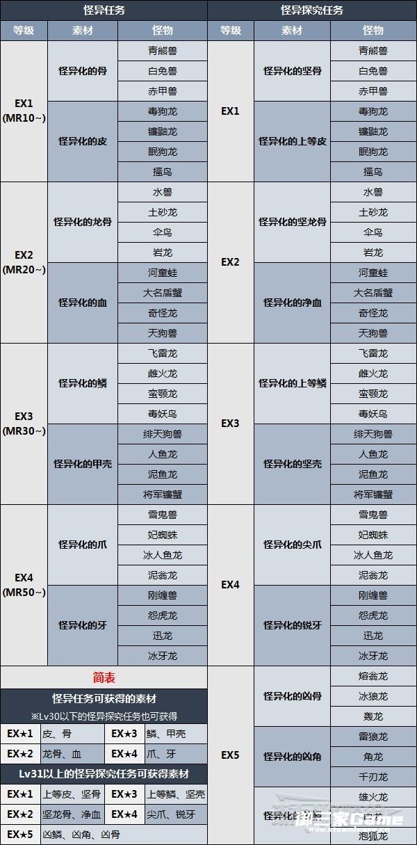 怪异化的高级素材(RARE8)可从怪异探究任务(Lv31以上)的怪物处获得,完成任务可固定获得奖励,通过部位破坏、剥取素材有20%概率获得。无法通过目标报酬、捕获报酬和掉落物获得。可用于怪异炼化。