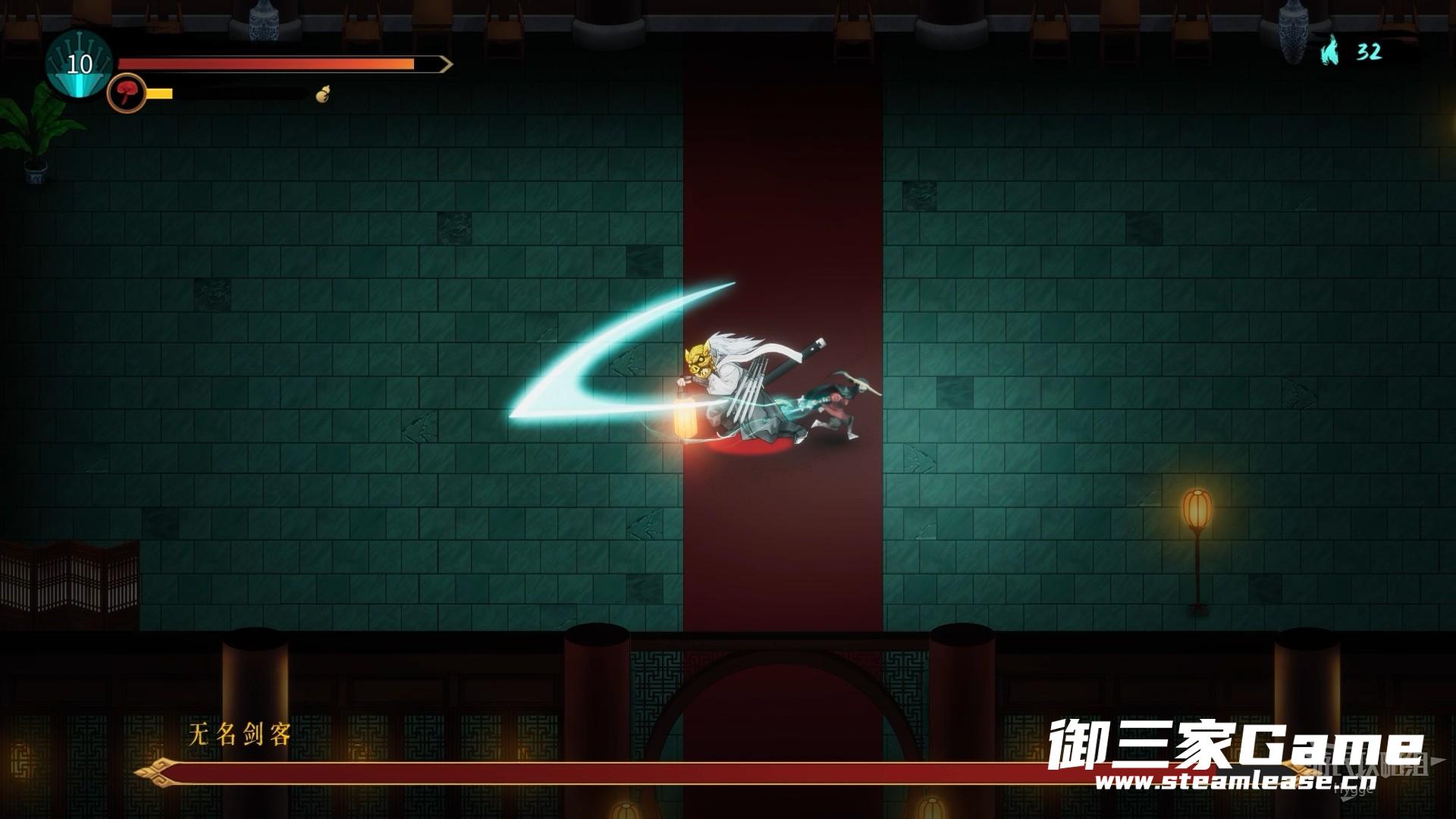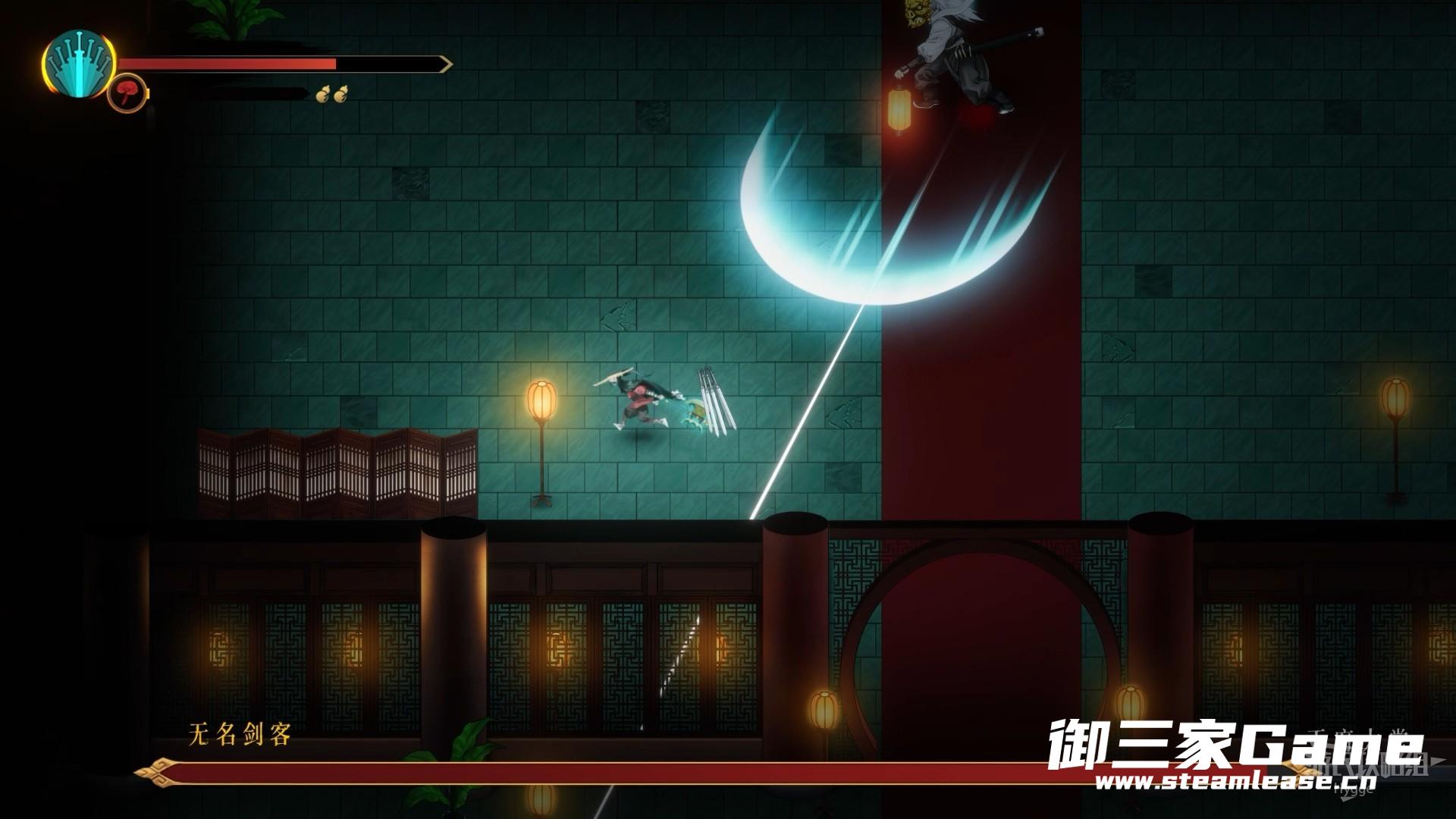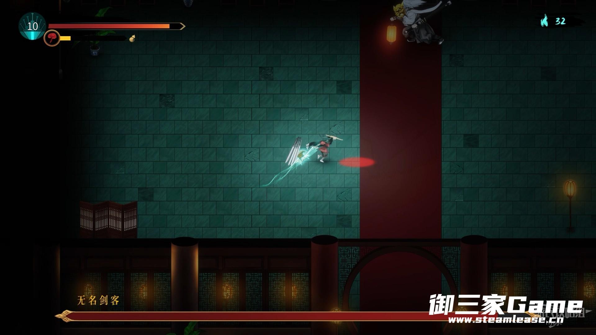 无名剑客会在蓄力锁定后向指示方向快速发射三道剑光,使用瞬身横向移动即可躲避该技能。或者玩家可以选择与无名剑客贴身短打,等到其剑光锁定后瞬身到他背后继续输出。