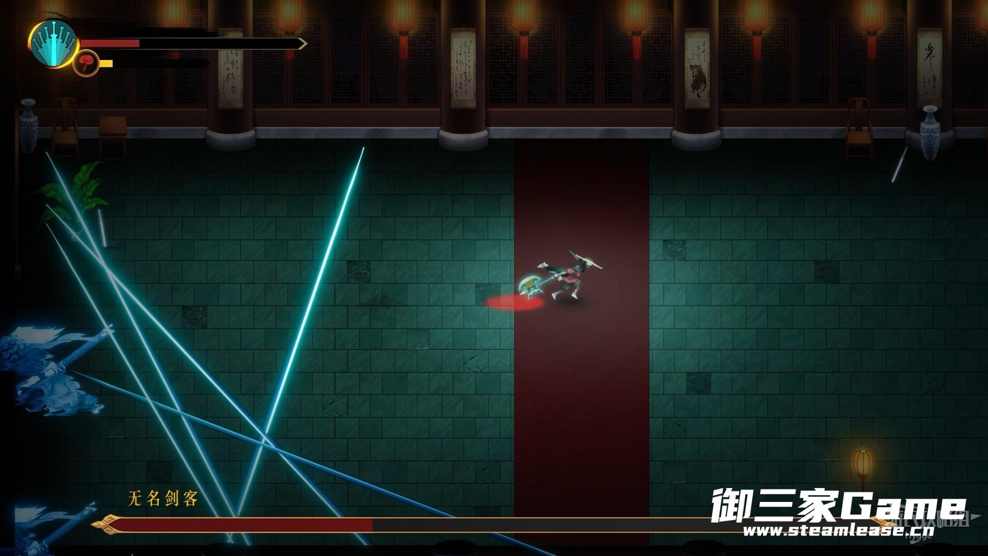 剑客会突然从地图中消失,随后在画面中出现数道红线,无名剑客会沿着红线进行攻击,远离红线即可躲避。