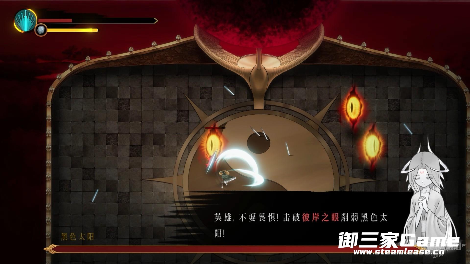 在第二阶段司马瑛会化身成为黑色太阳,并在场地中召唤彼岸之眼。我们只有破坏彼岸之眼才能够伤害到黑色太阳。