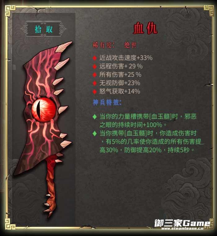 ·当你携带[血玉髓]时,你造成伤害时,有5%的几率使你造成的所有伤害提高30%,防御提高20%,持续5秒。