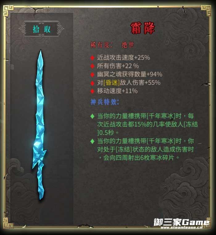 ·当你的力量槽携带[千年寒冰]时,每次近战攻击都15%的几率使敌人[冻结]0.5秒。