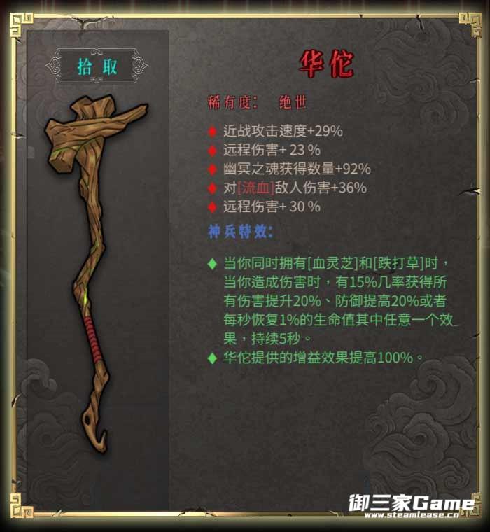·当你同时拥有[血灵芝]和[跌打草]时,当你造成伤害时,有15%几率获得所有伤害提升20%、防御提高20%或者每秒恢复1%的生命值其中任意一个效果,持续5秒。